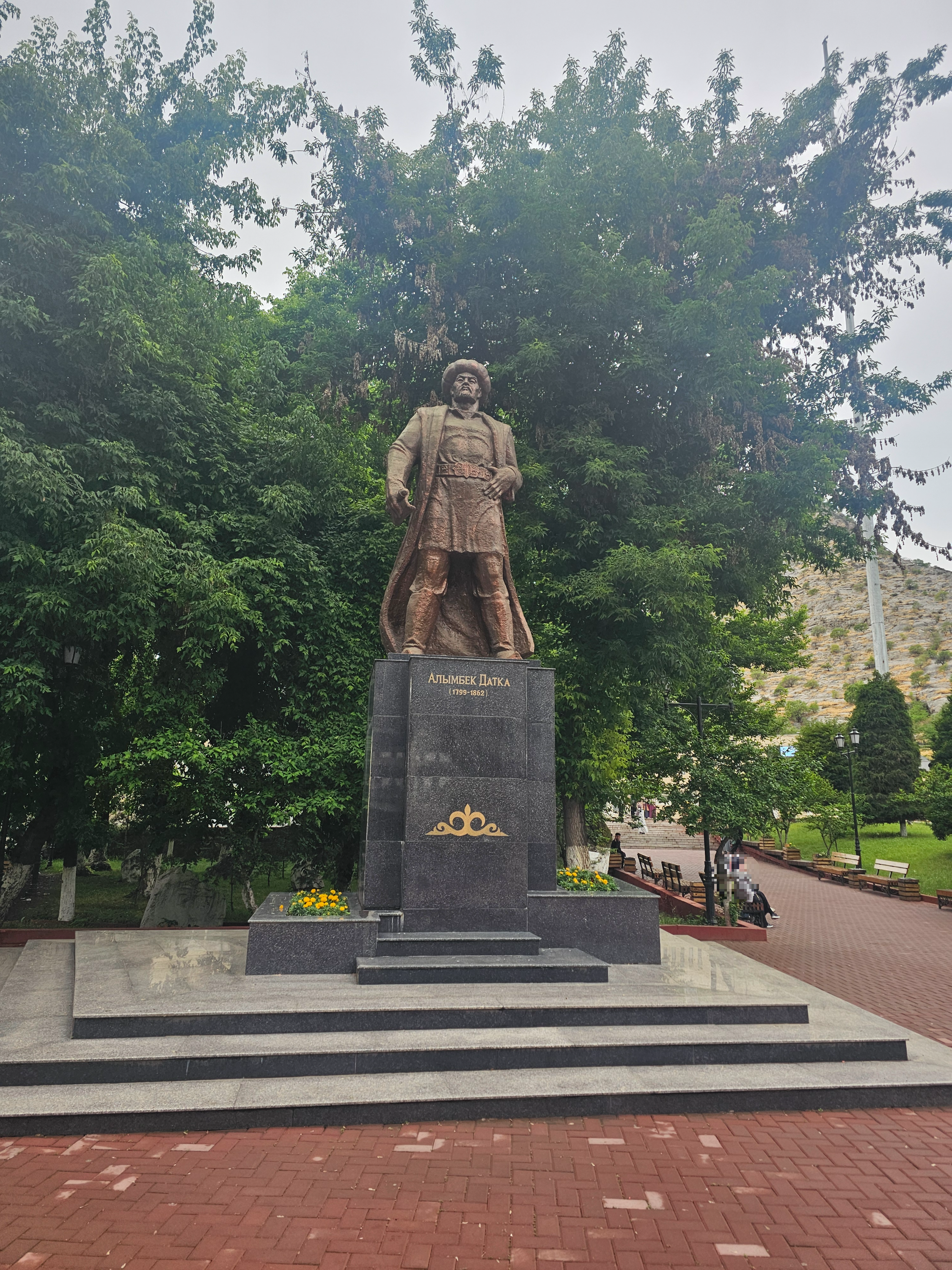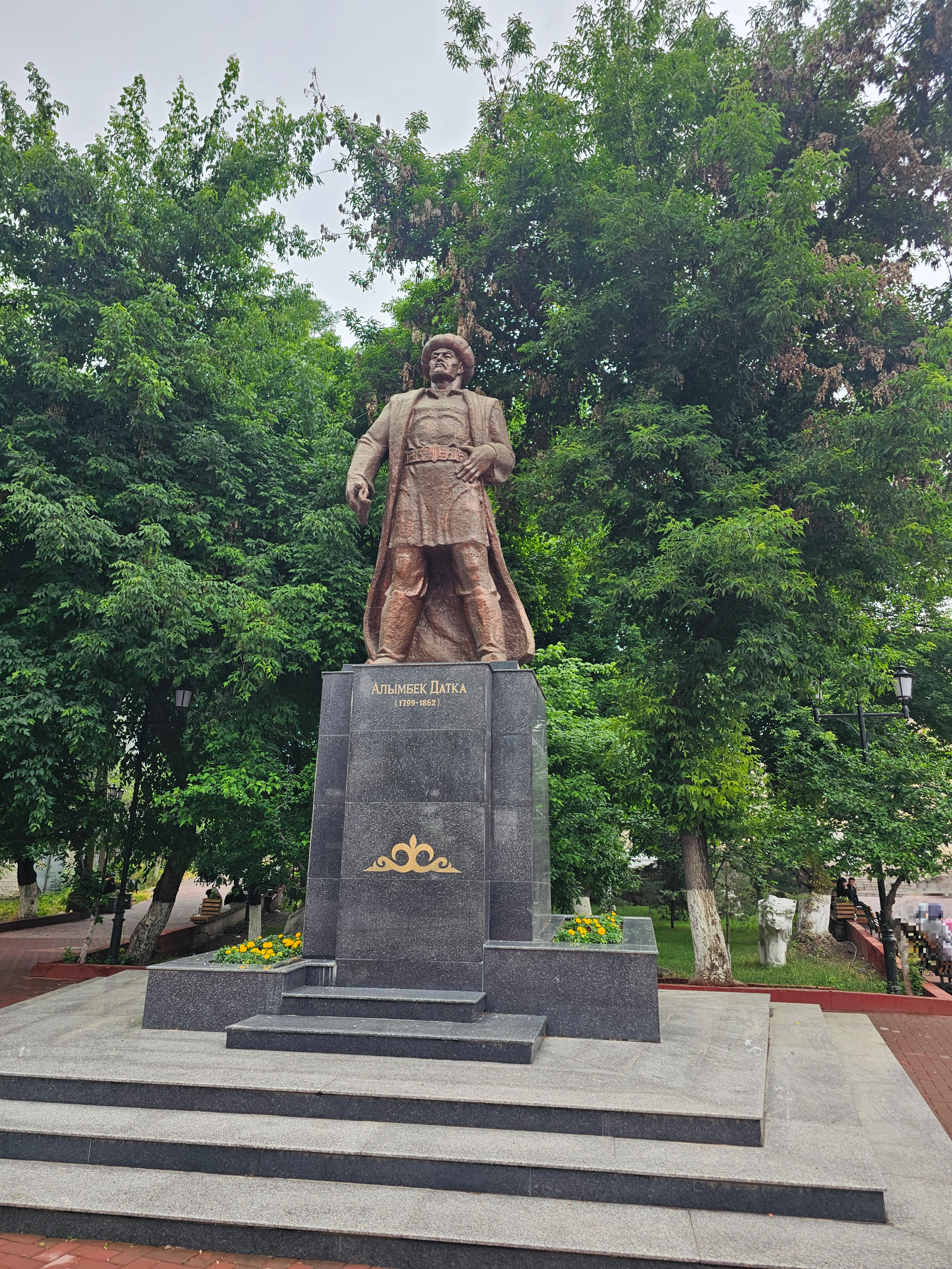 코칸트 칸국의 알라이 키르기스를 다스렸던 알림벡 닷카(Алымбек-датка, 1799-1862)의 동상이 세워져 있습니다. 당시 정치경제적으로 유명했던 키르기스 우익(Оң канат) 바르기(Баргы)부족 아산 비(Асан-бий)의 아들로 태어나 사마르칸트, 부하라, 이스탄불, 카슈가르 등 다양한 곳을 찾아 견문을 넓혔고, 아버지와 주변 사람들에게 정치를 배우며 자랐습니다.
