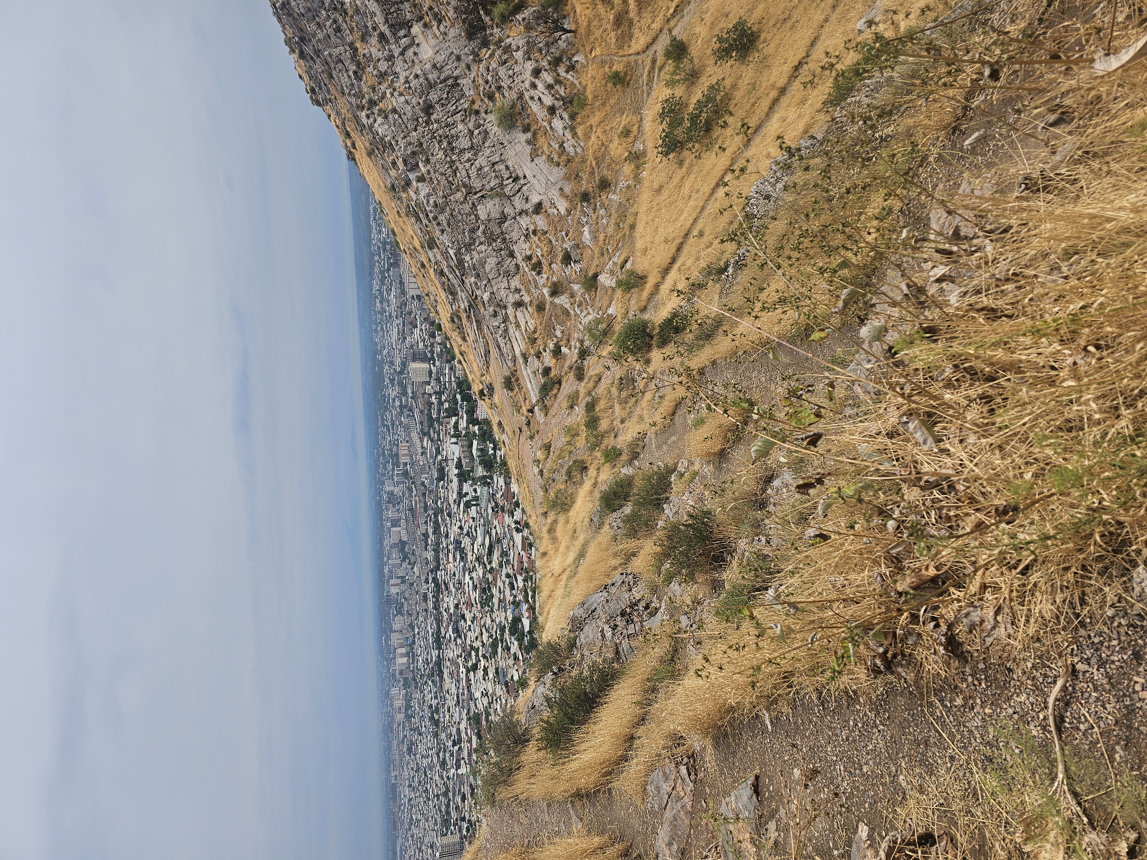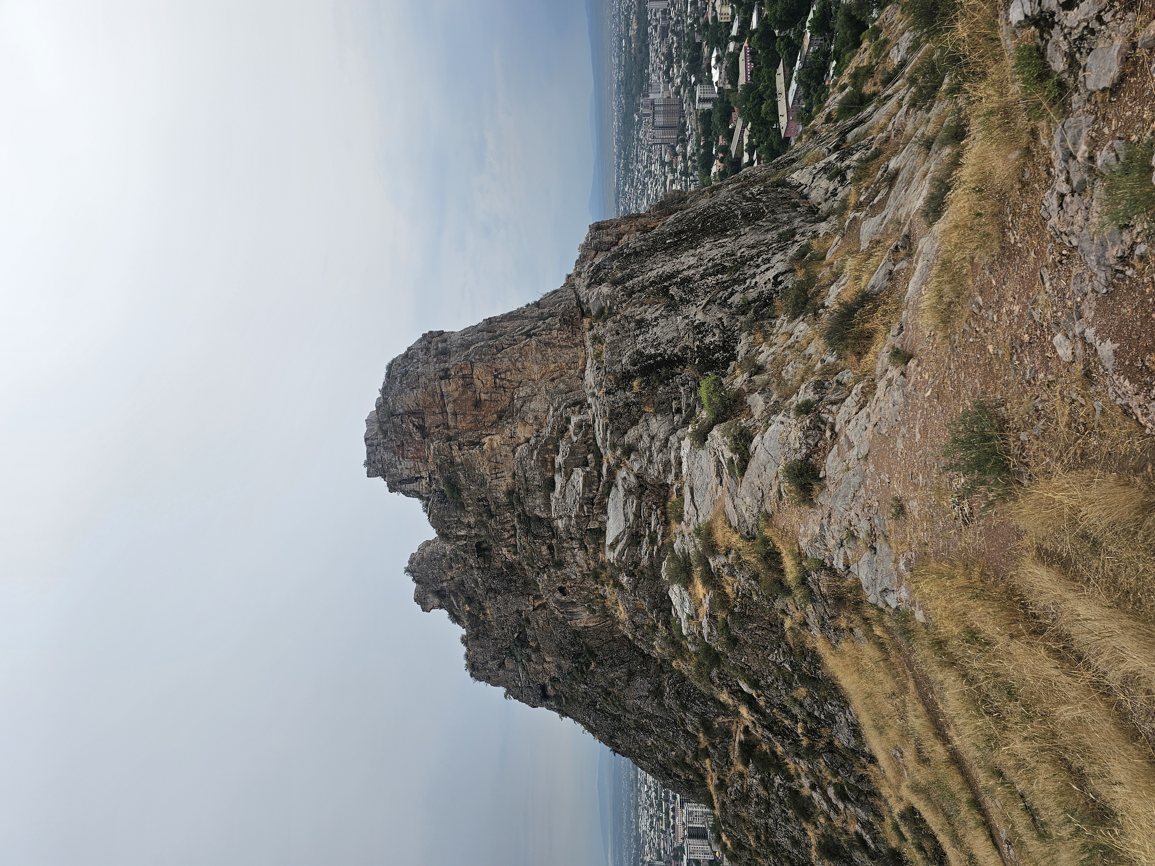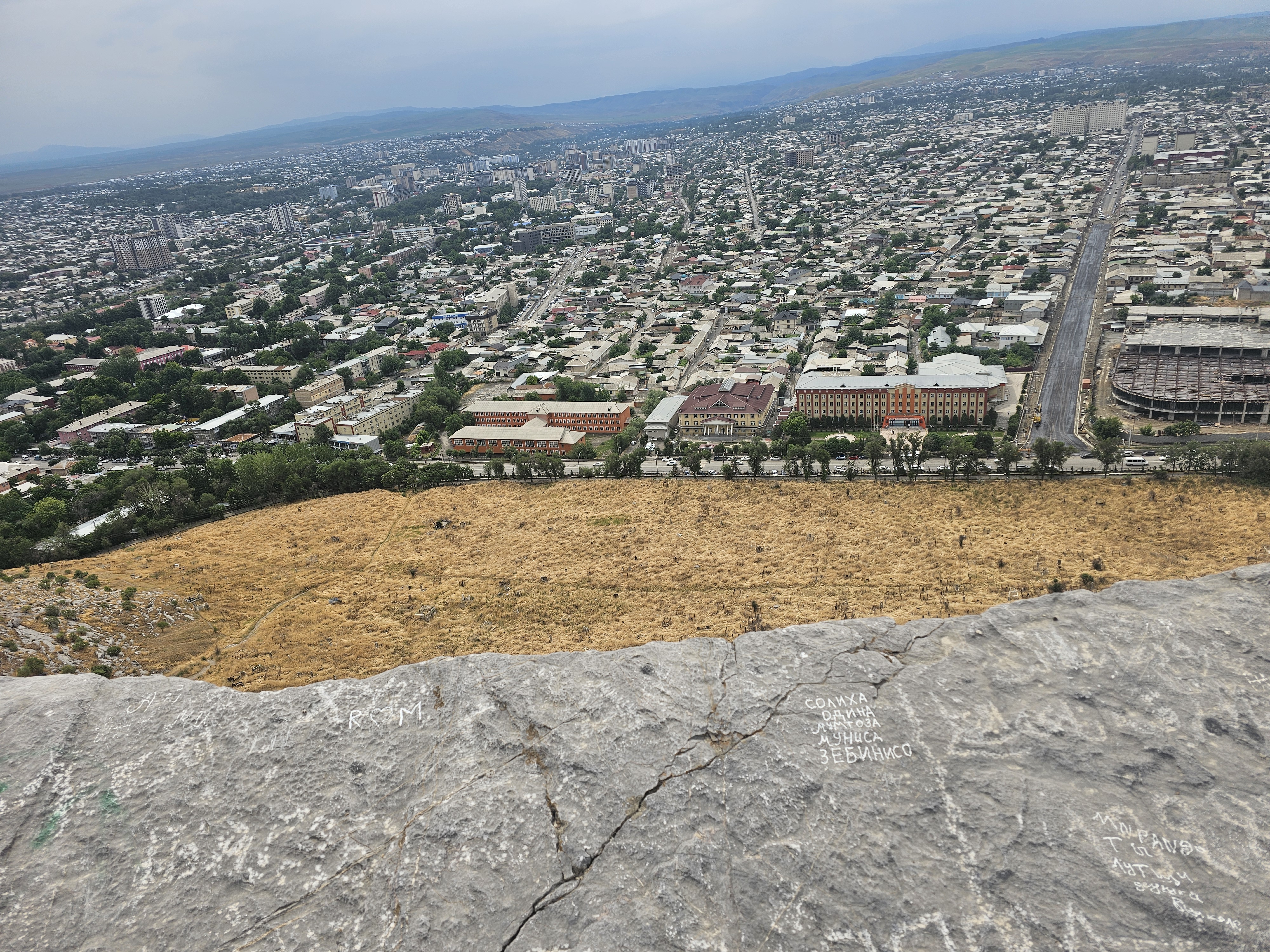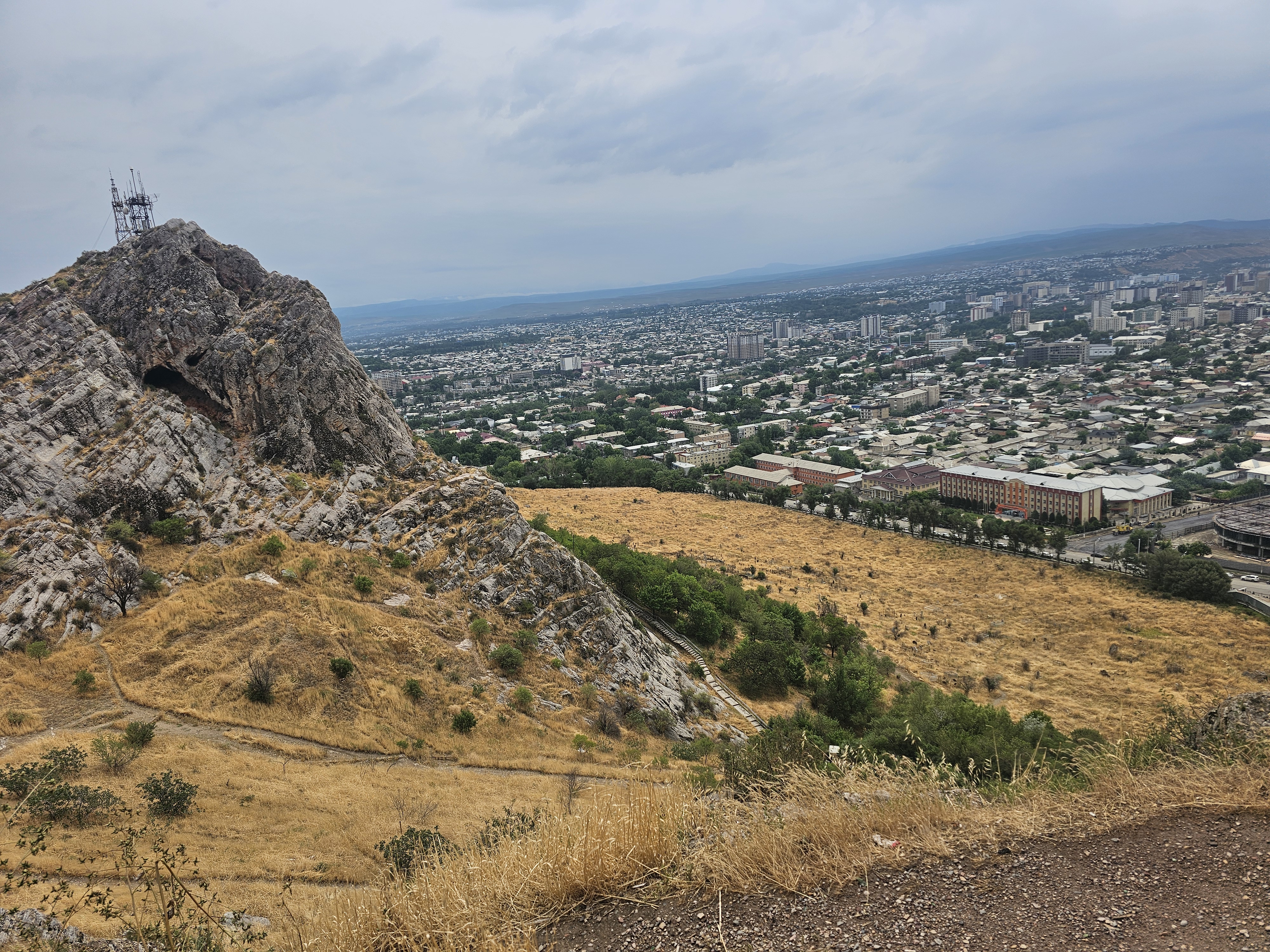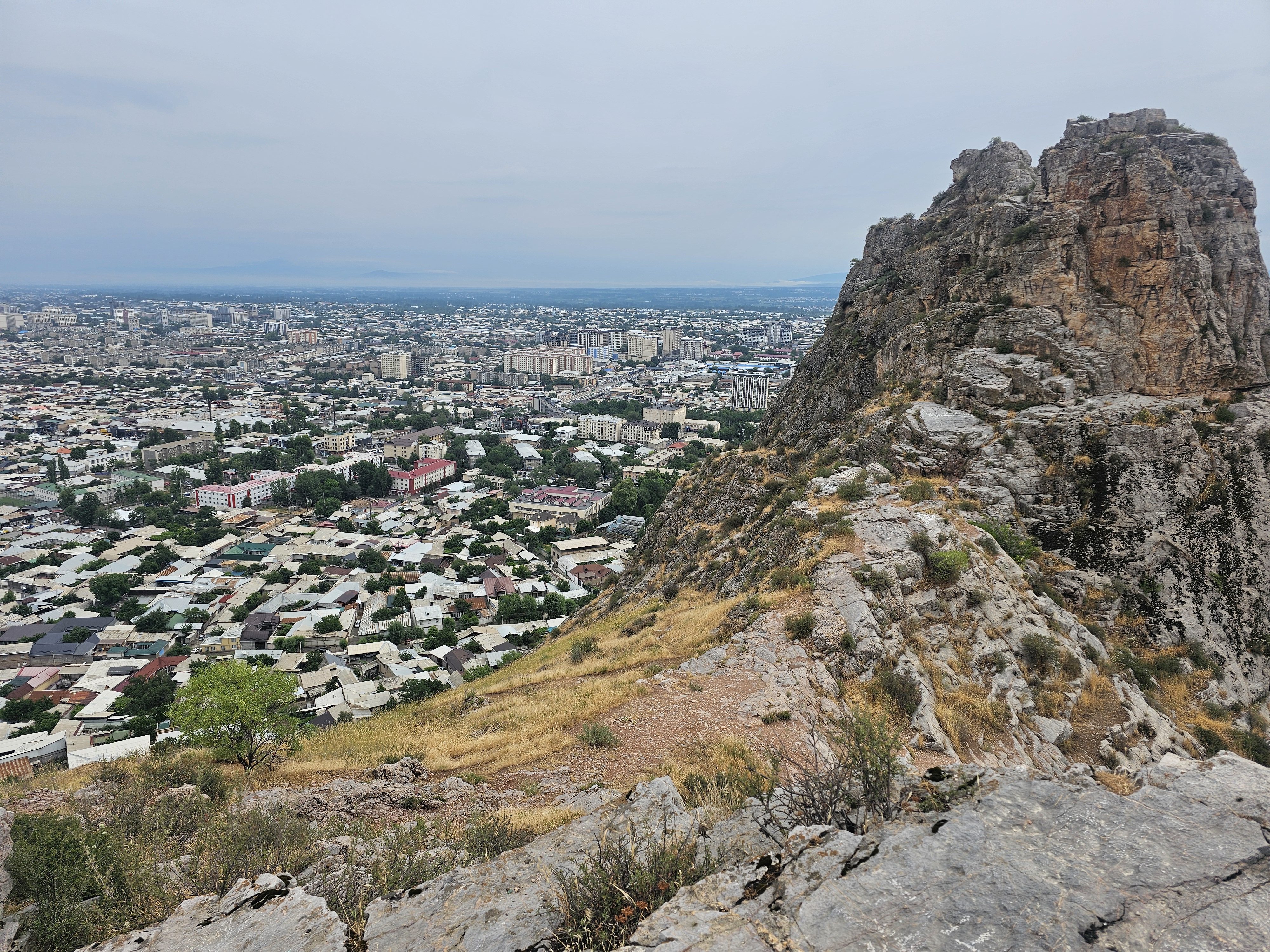 동굴 위쪽으로 올라가는 길이 있어서 암벽을 타고 올라갑니다. 경치가 장난이 아니더군요. 남쪽 아래로 내려다보니 바티랄시디코프 키르기즈우즈베크국제대학교(Кыргызско-Узбекский Международный университет им. Батыралы Сыдыкова)와 건설중인 술라이만몰(Sulaiman Mall), 오시 빌림오르도(Ош Билим Ордо), 23번 학교(Школа №23) 등 다양한 교육시설과 그 뒤로 펼쳐진 주거 지역이 보입니다. 넓은 평야 위에 건설된 도시같았습니다.