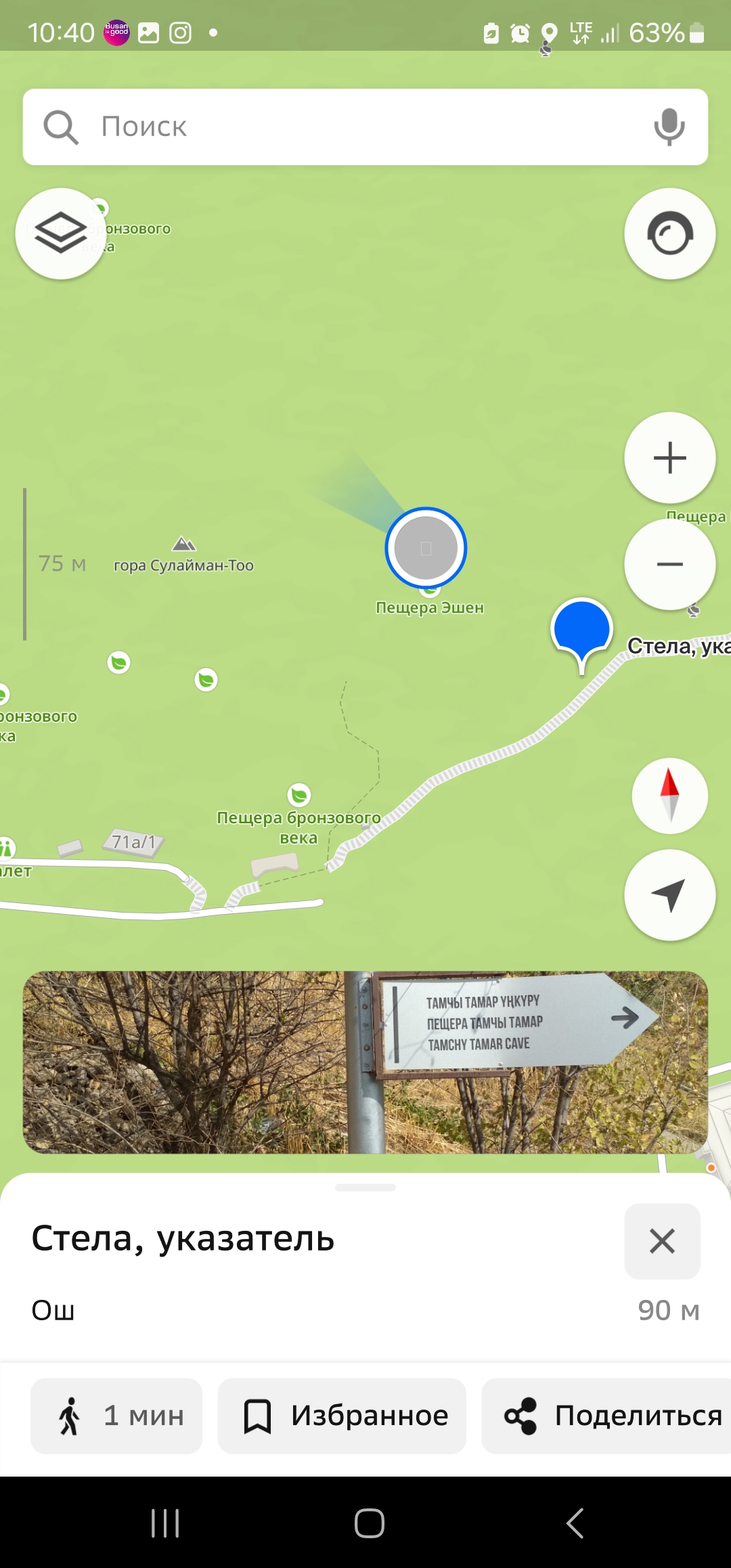 키르기스스탄 오시 술라이만투의 산책로를 걷던 중 두 개의 동굴로 가는 갈림길을 봤습니다. 모험심을 자극하는 이 표지판을 따라 술라이만투의 세 번째 봉우리에 위치한 에셴운쿠르 동굴(Пещера Эшен-Ункур) 혹은 에셴 동굴(Пещера Эшен)로 가봅니다.