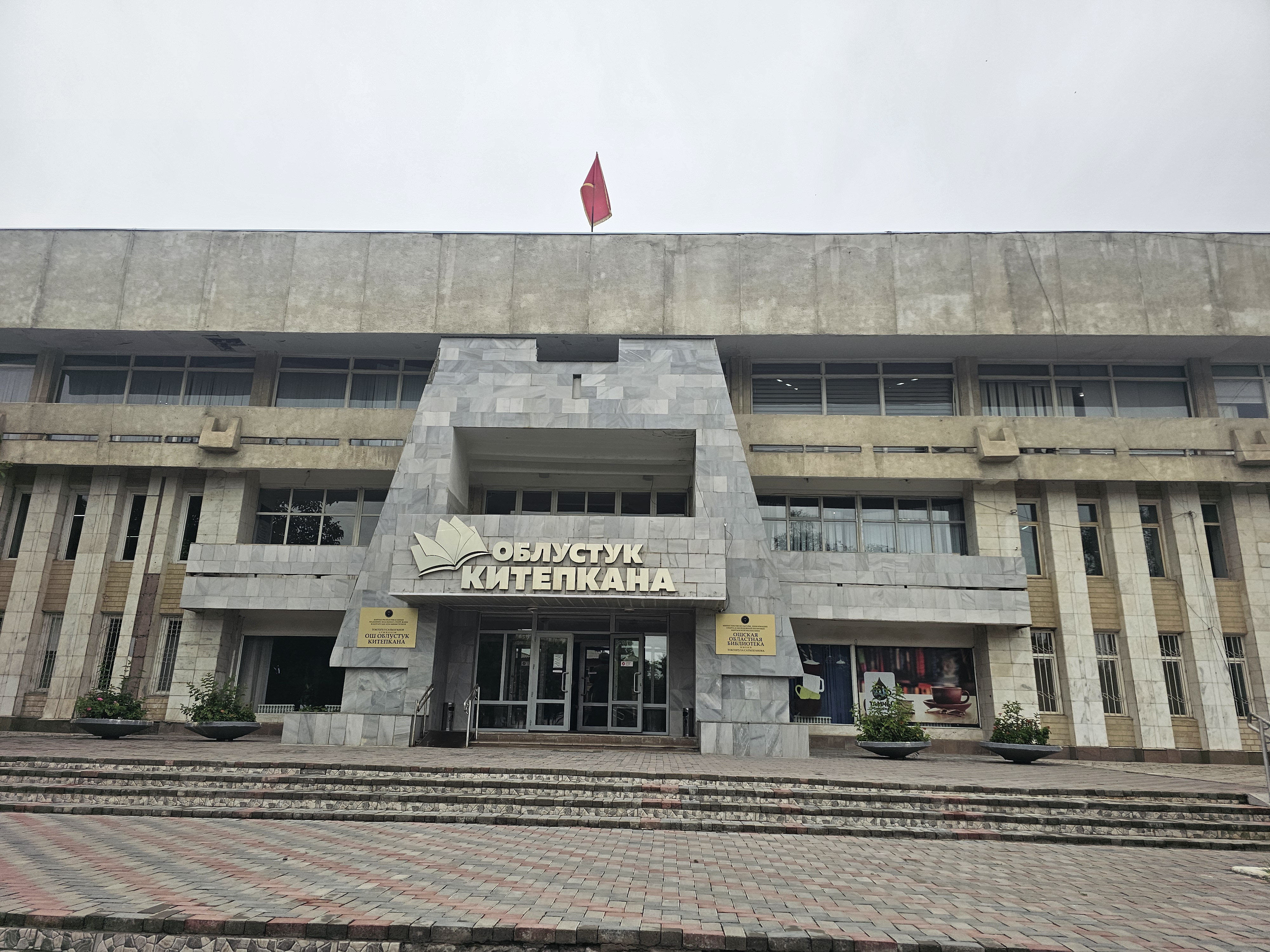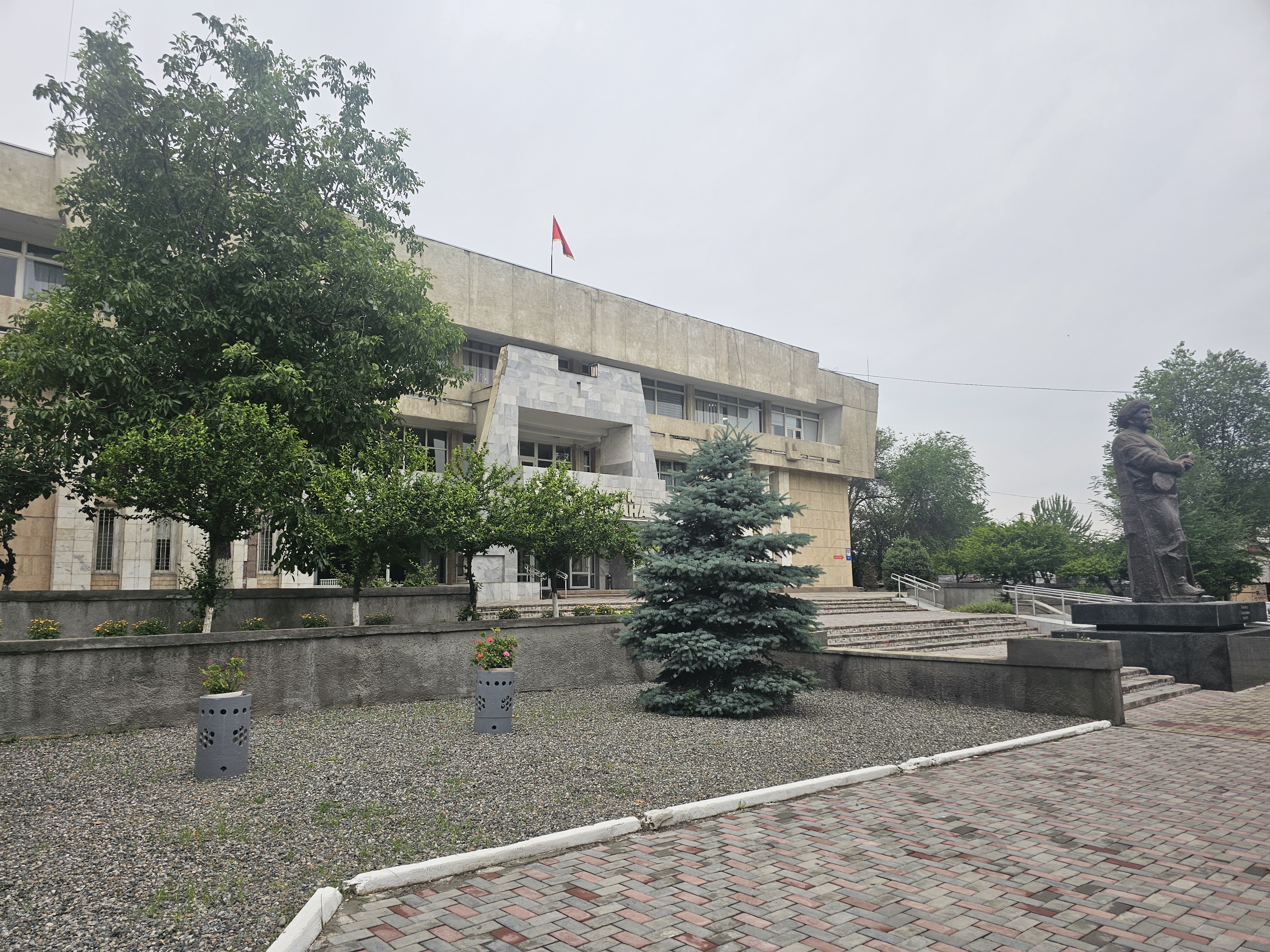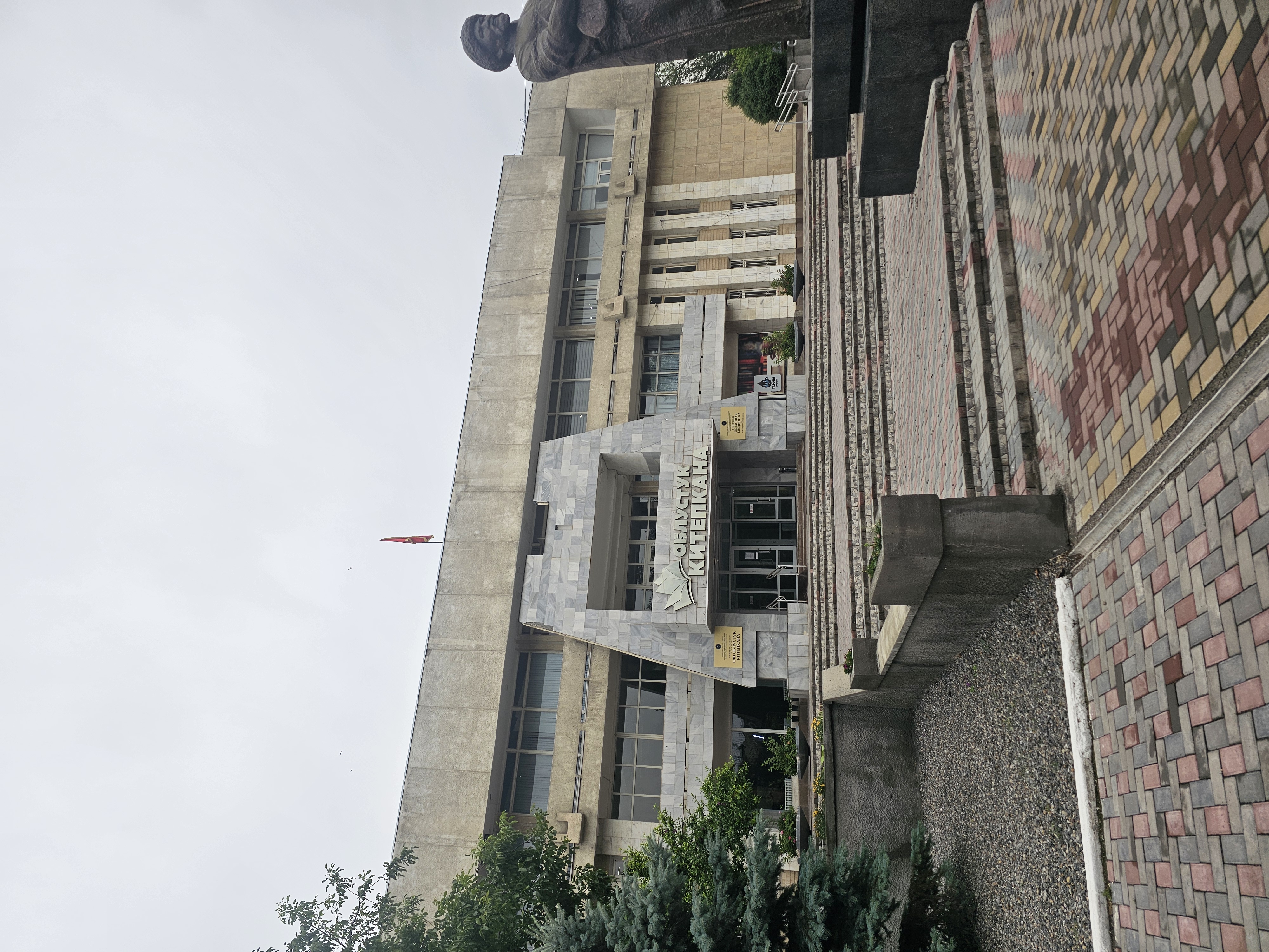 이 도서관 앞에는 도서관 이름의 유래가 되는 톡토굴 사틸가노프의 동상이 있습니다. 100솜의 주인공이자 키르기스 민족 아킨(민족음유시인) 겸 코무즈 연주자인 톡토굴 사틸가노프(Токтогул Сатылганов, 1864-1933). 그 명성에 맞게 이 동상에서 그는 코무즈를 잡고 서 있습니다.
