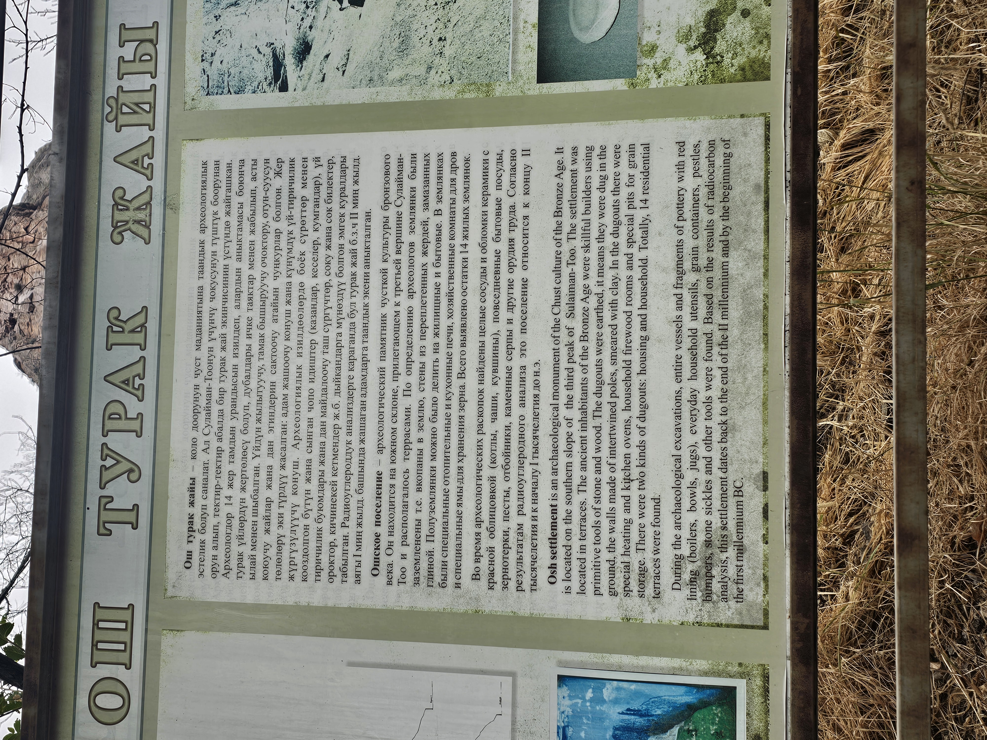 키르기스스탄 오시 술라이만투의 3봉 남쪽 기슭에 위치한 청동기시대 추스트 문화(Чустская культура)에 속하는 오시정착지(Ошское поселение, -15~-7세기)입니다.