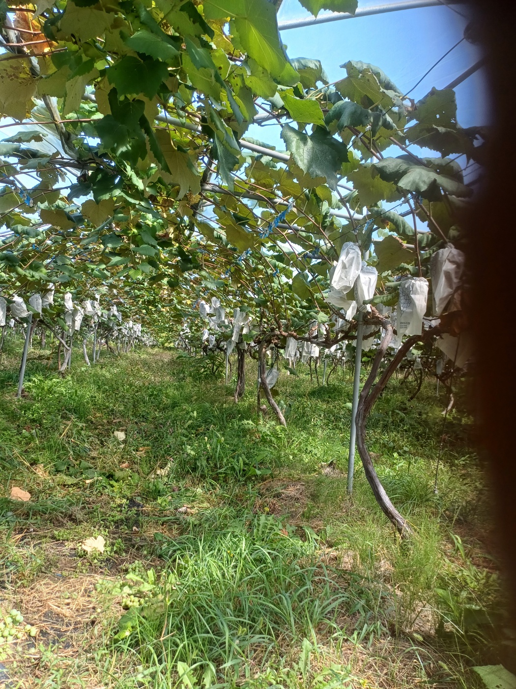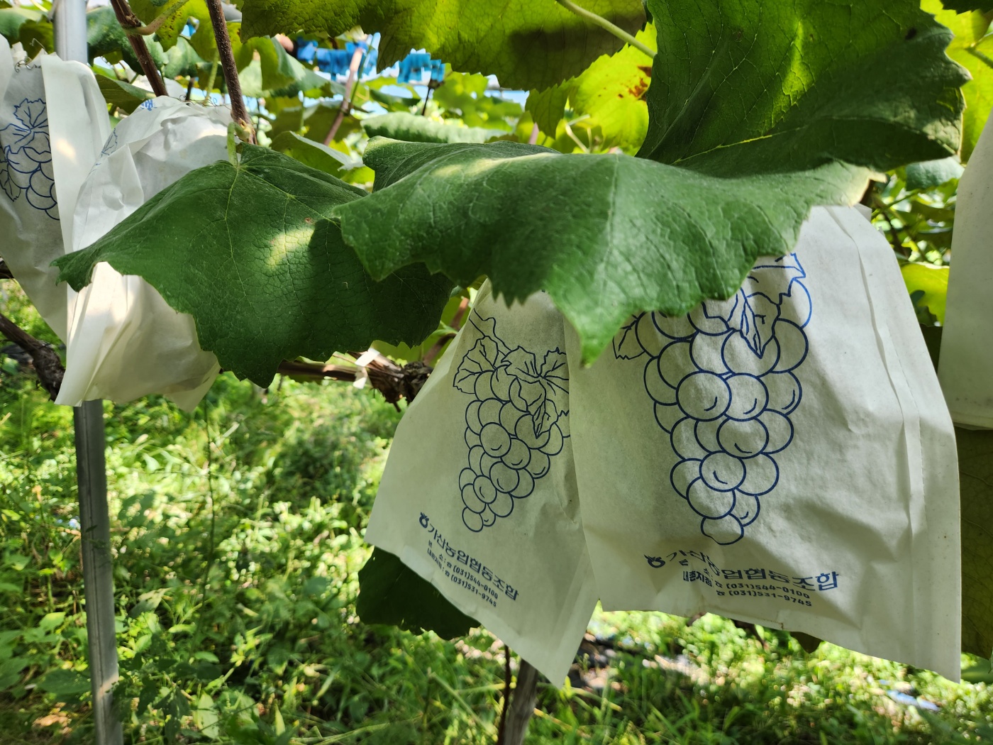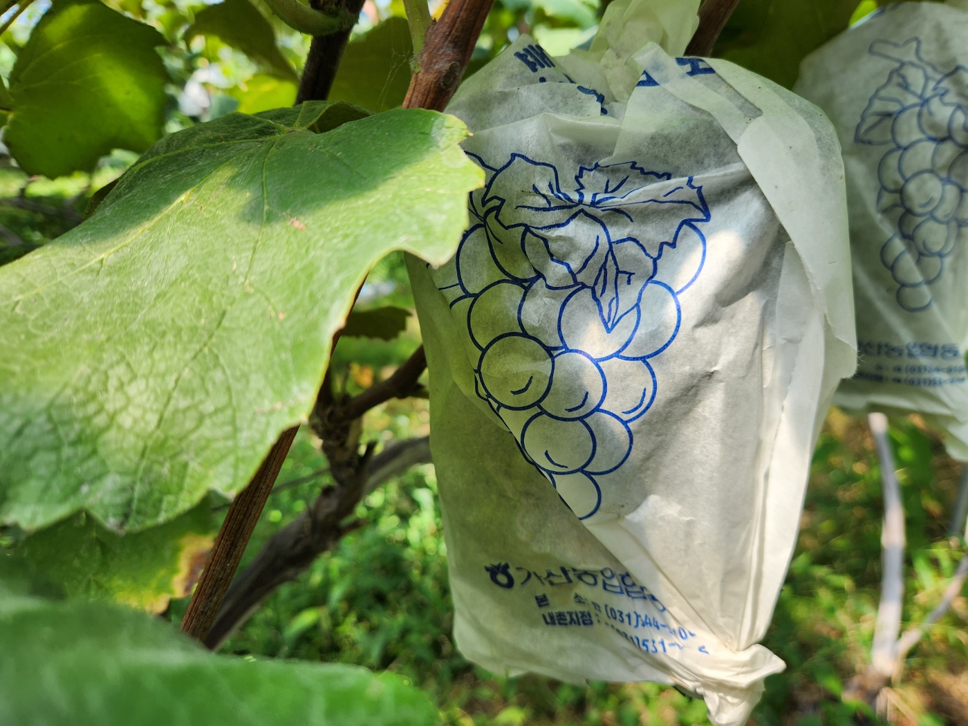 포도나무가 다 자라서 열매를 맺기 시작할 때 씌워둔 봉지. 그 안에서 포도알이 커지면서 익기 시작합니다.