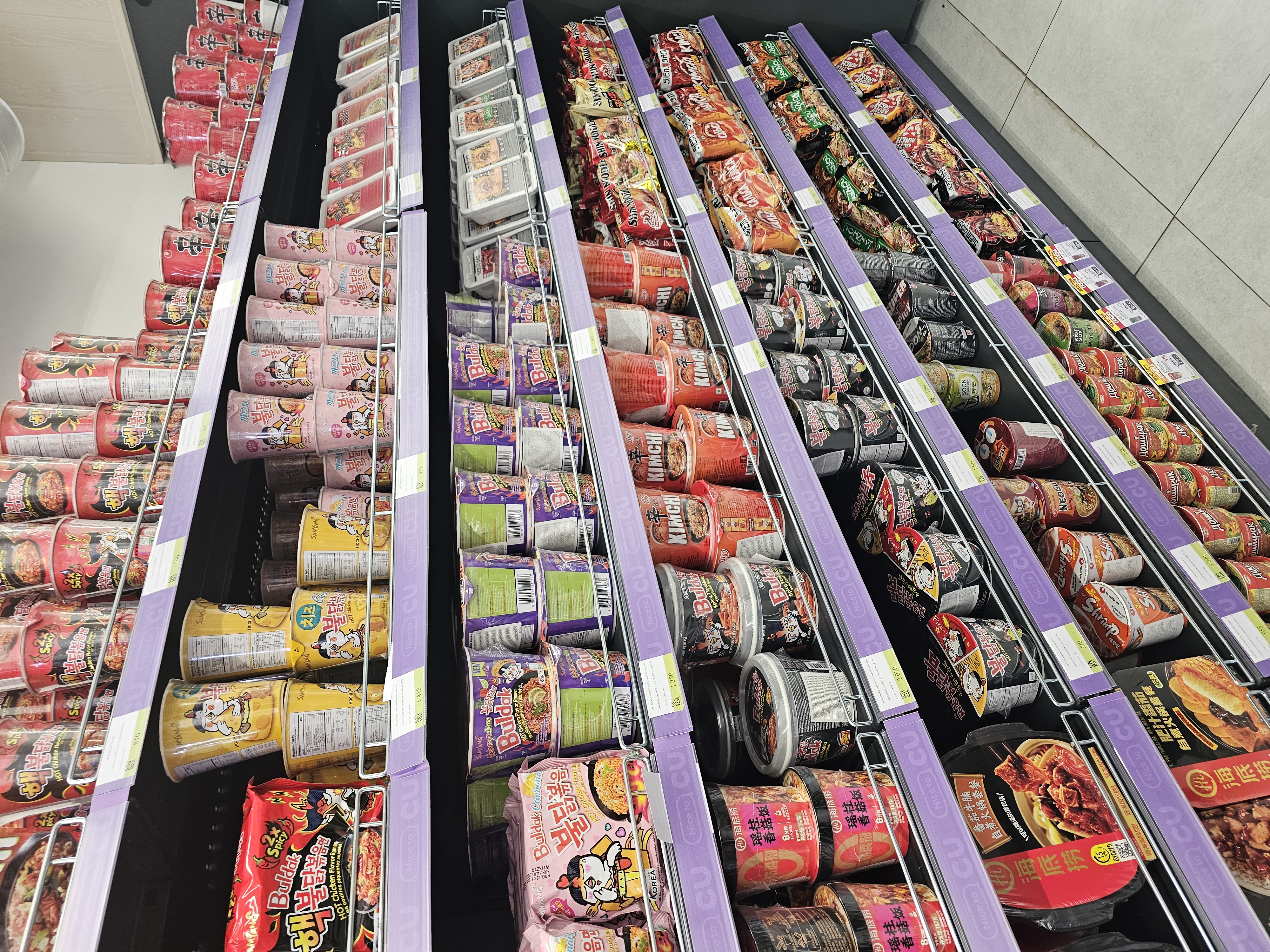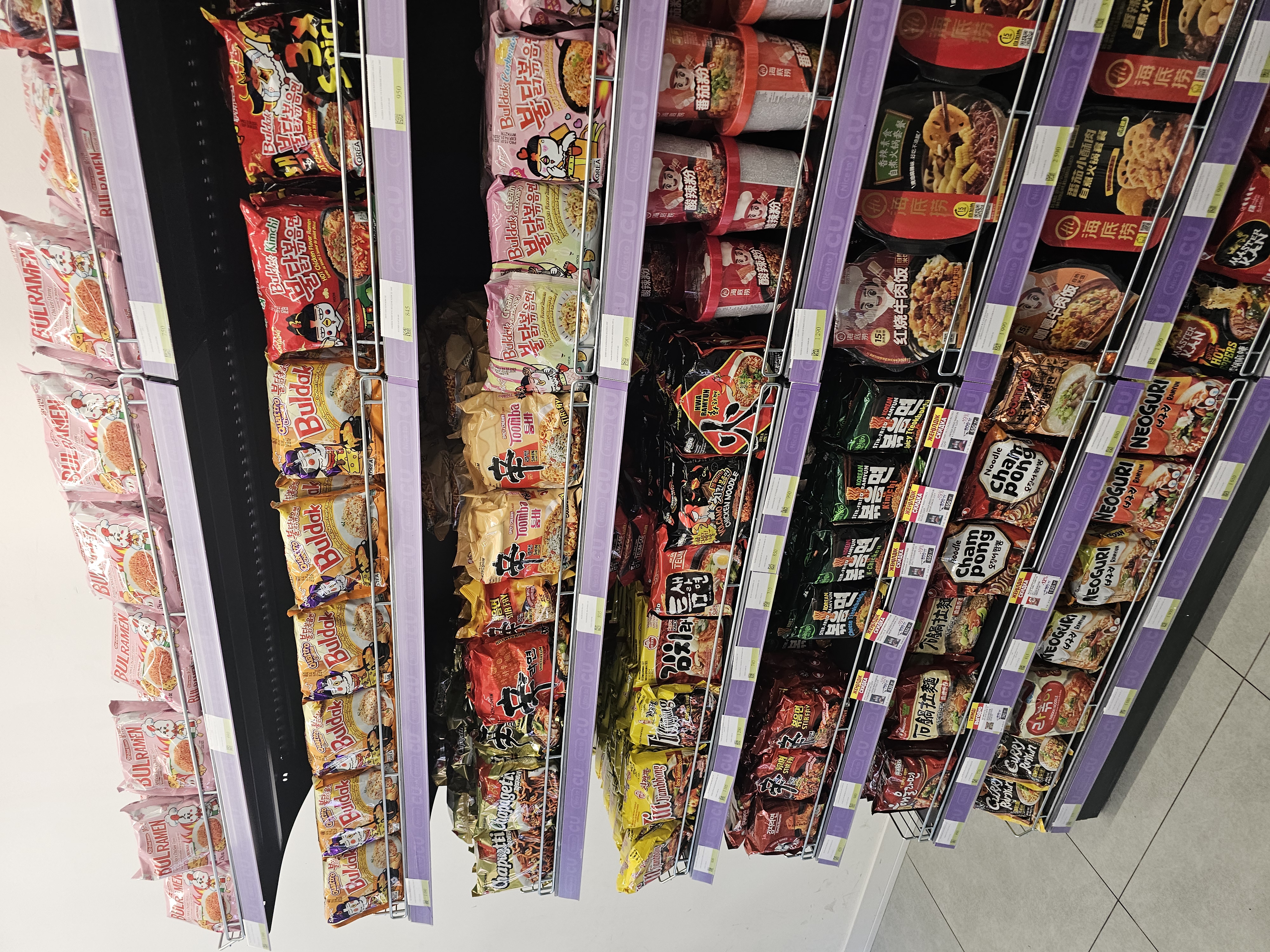 라면 코너에서는 봉지라면이 710텡게부터 1990텡게, 컵라면이 790텡게부터 2070텡게 까지 다양한 가격대로 판매되고 있습니다. 진라면, 불닭볶음면, 너구리 등 한국의 인기 제품이 그대로 진열되어 있으며, 한국 라면에 익숙한 현지 소비자들이 꾸준히 찾는 모습이었습니다.