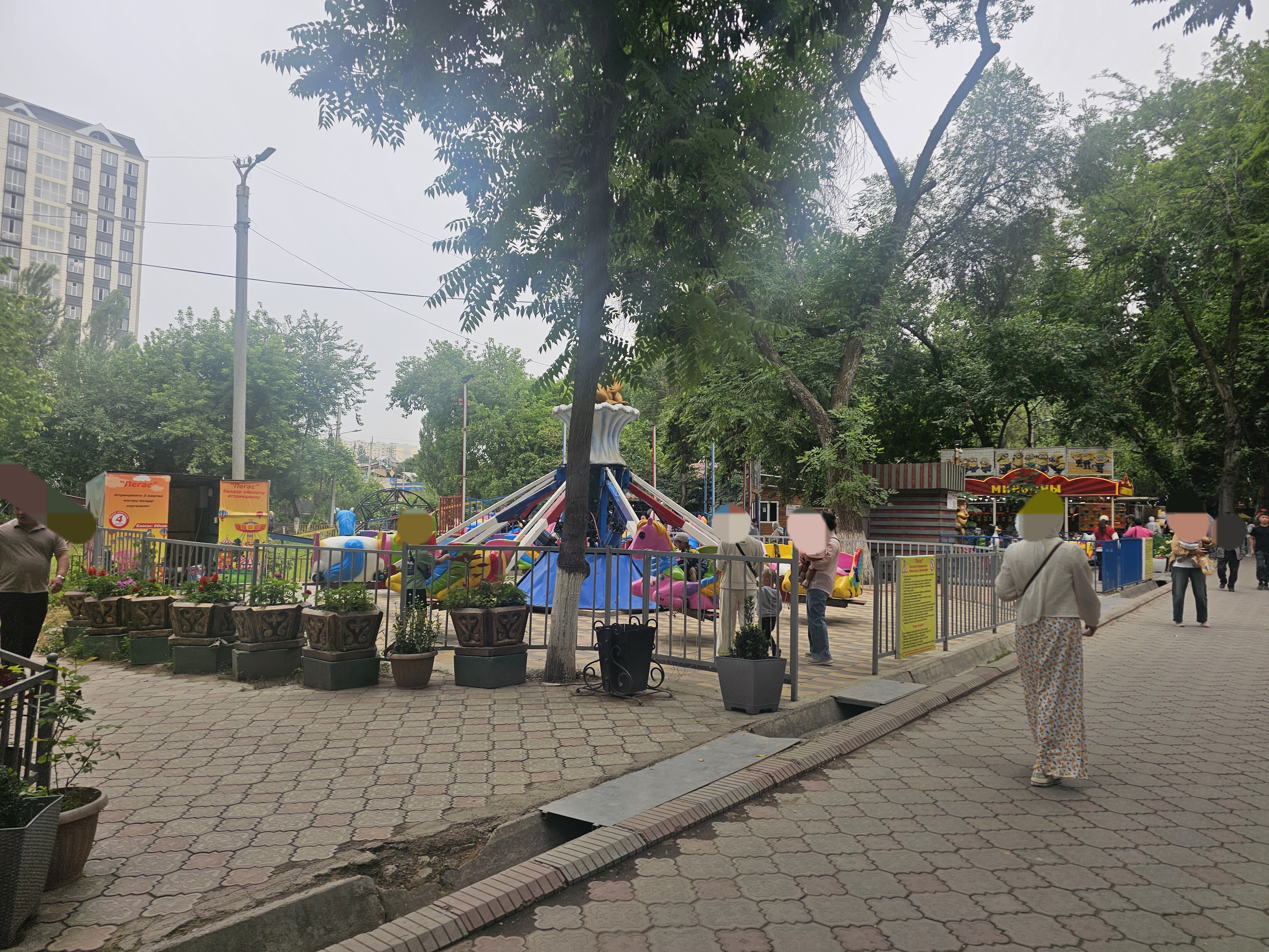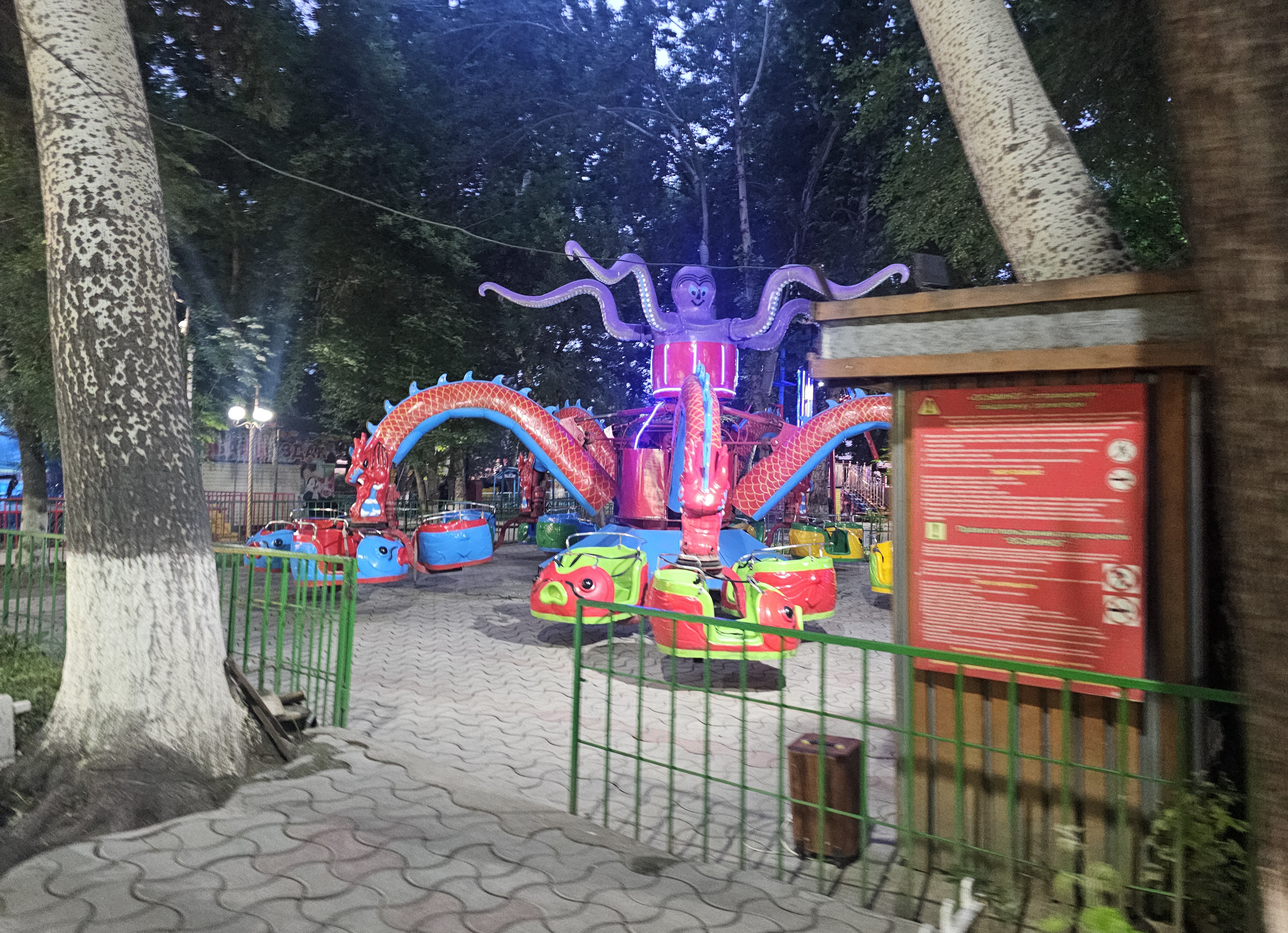 이곳에는 다양한 놀이기구들이 있습니다. 프리스비(자이로스윙, маятник), 범퍼카(автодром), 귀신의 집(комната страха)이 공원 북쪽 입구에서 방문객을 맞아줍니다.