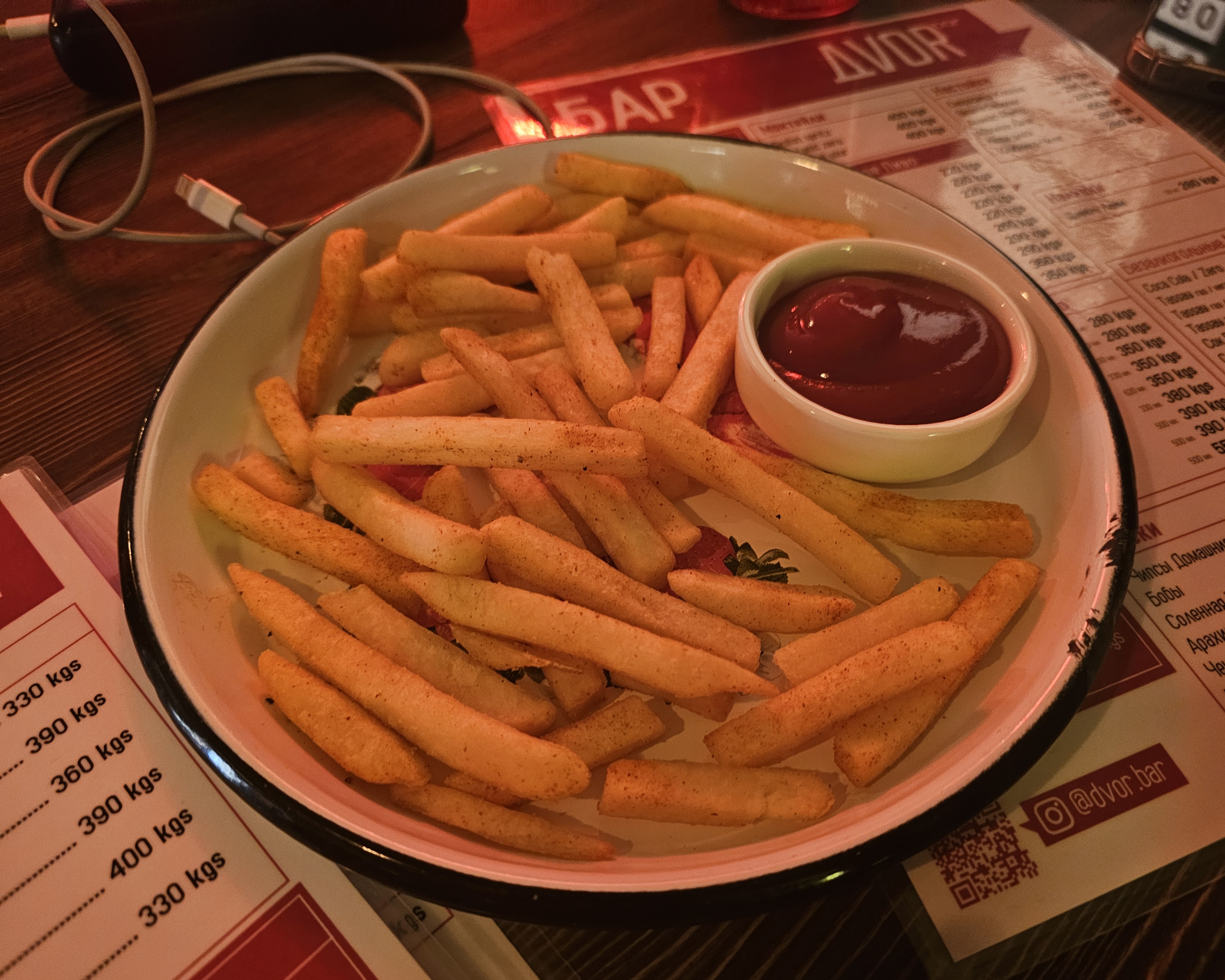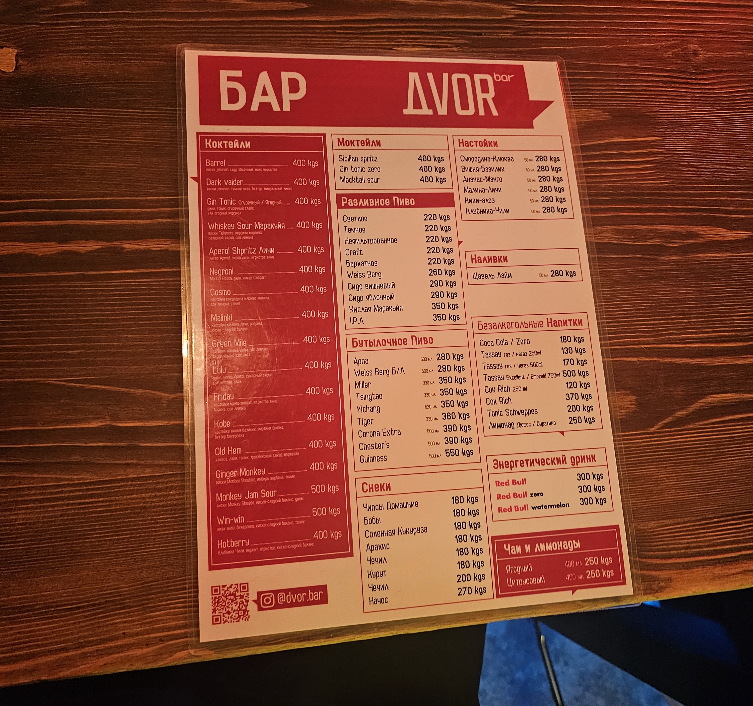 키르기스스탄 비슈케크 옥탸블구(시월구)의 바이틱아티르길(Улица Байтик баатыра)에위치한 바 드보르(Dvor). двор는 러시아어로 '안마당, 마당'이란 뜻으로, 이름 처럼 편안하고 캐주얼한 분위기의 바입니다.
