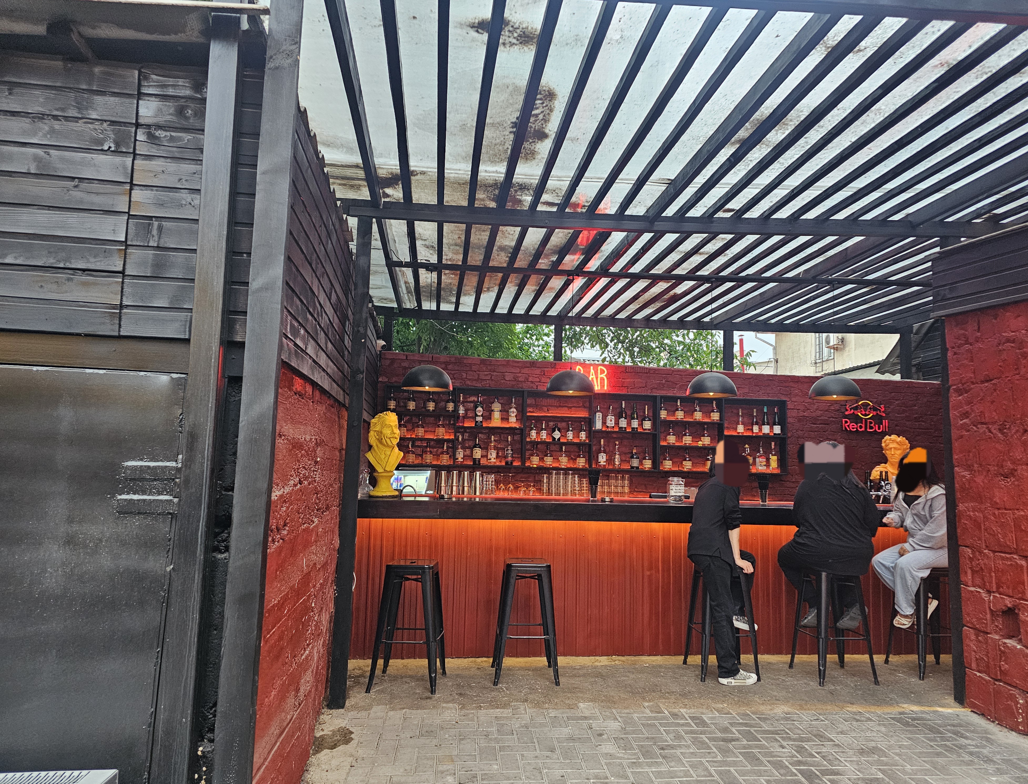 뒷문으로 나가면 넓은 야외 테라스가 펼쳐집니다. 테이블바 형태로 꾸며져 있어, 밤바람을 맞으며 여유롭게 한 잔 즐기기에 제격입니다. 비슈케크 여행 중 친구들과 모여 현지 맥주 한 잔 기울이며 이야기꽃을 피우기 좋은 장소입니다. 이렇게 다양한 좌석이 있는 곳에서 술 한 잔 즐기면서 친구들과 시간을 보내는 것도 여행의 묘미겠죠.