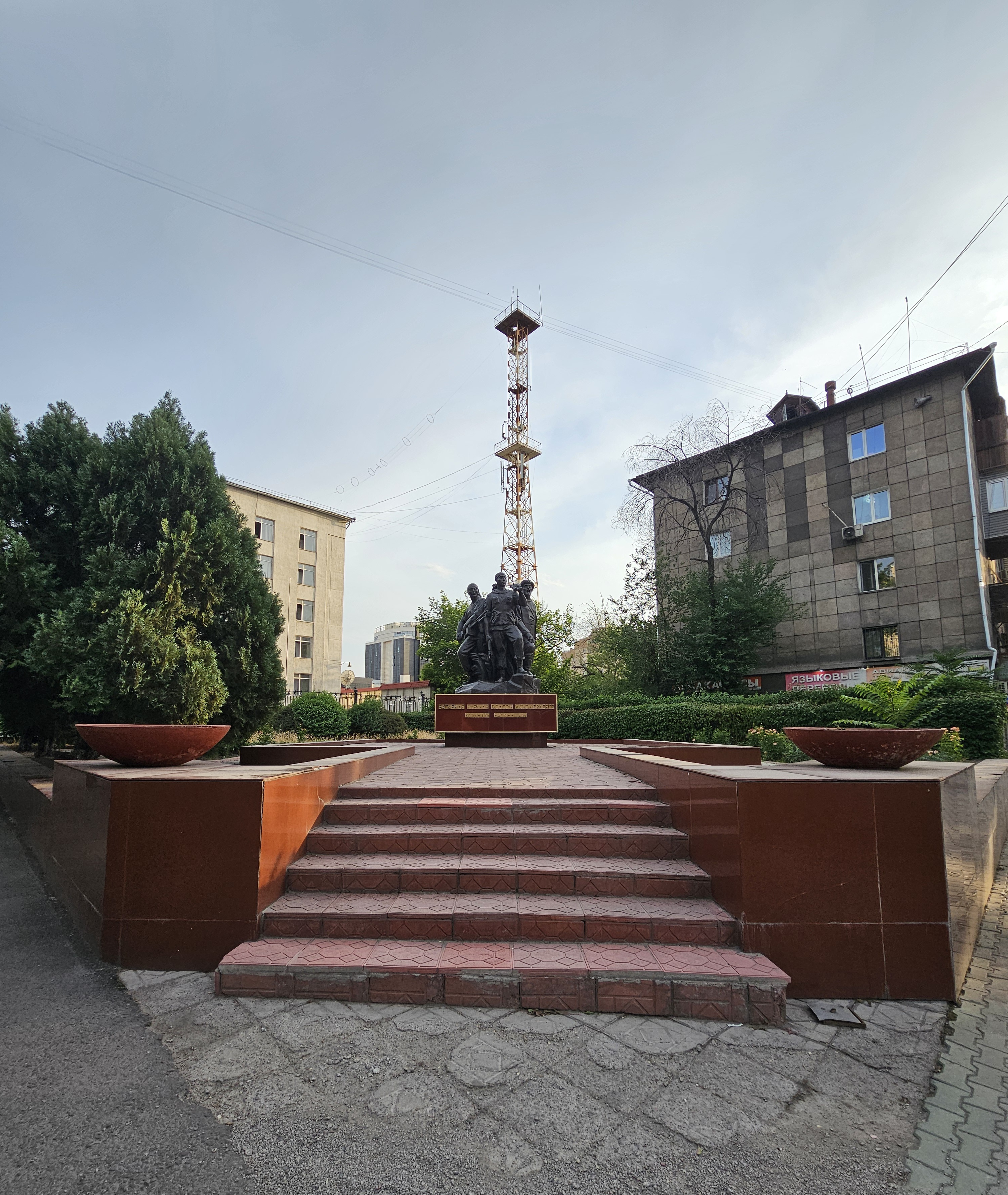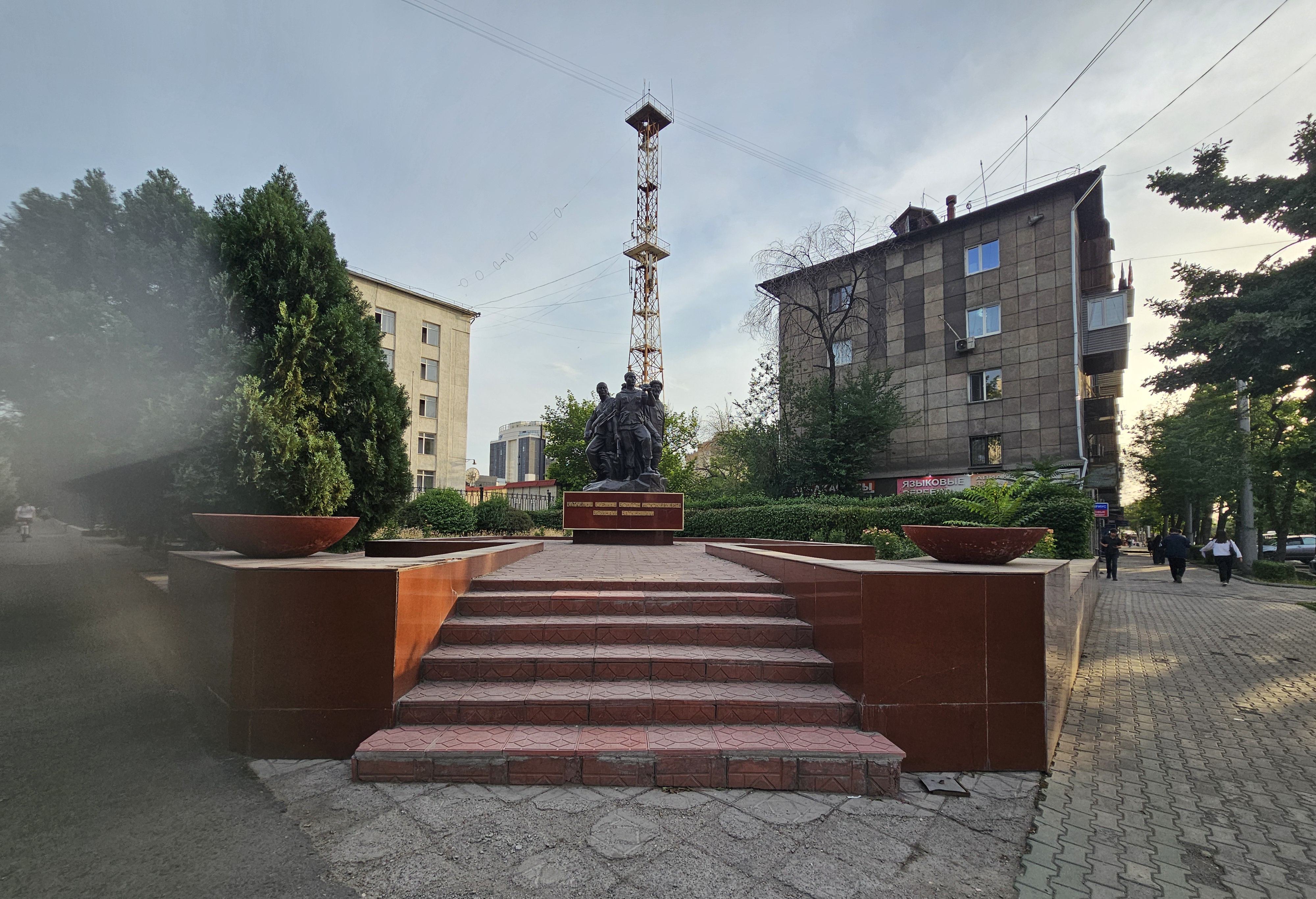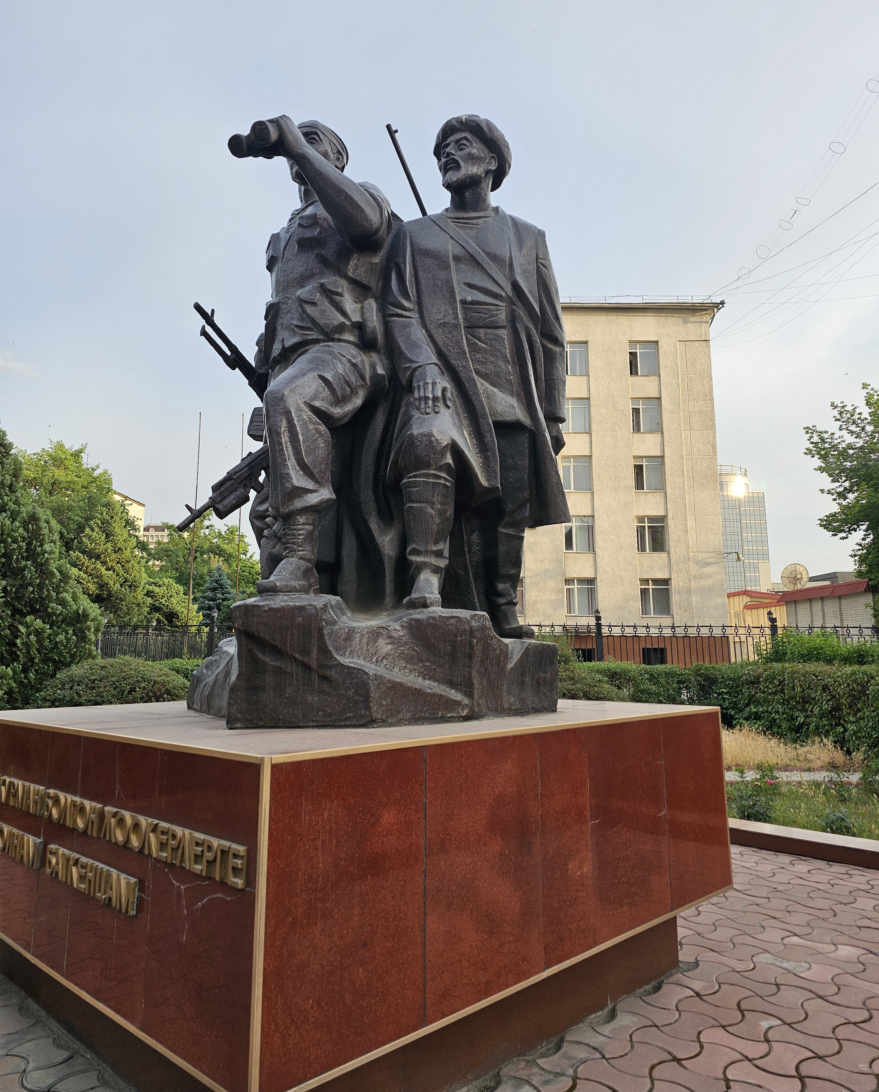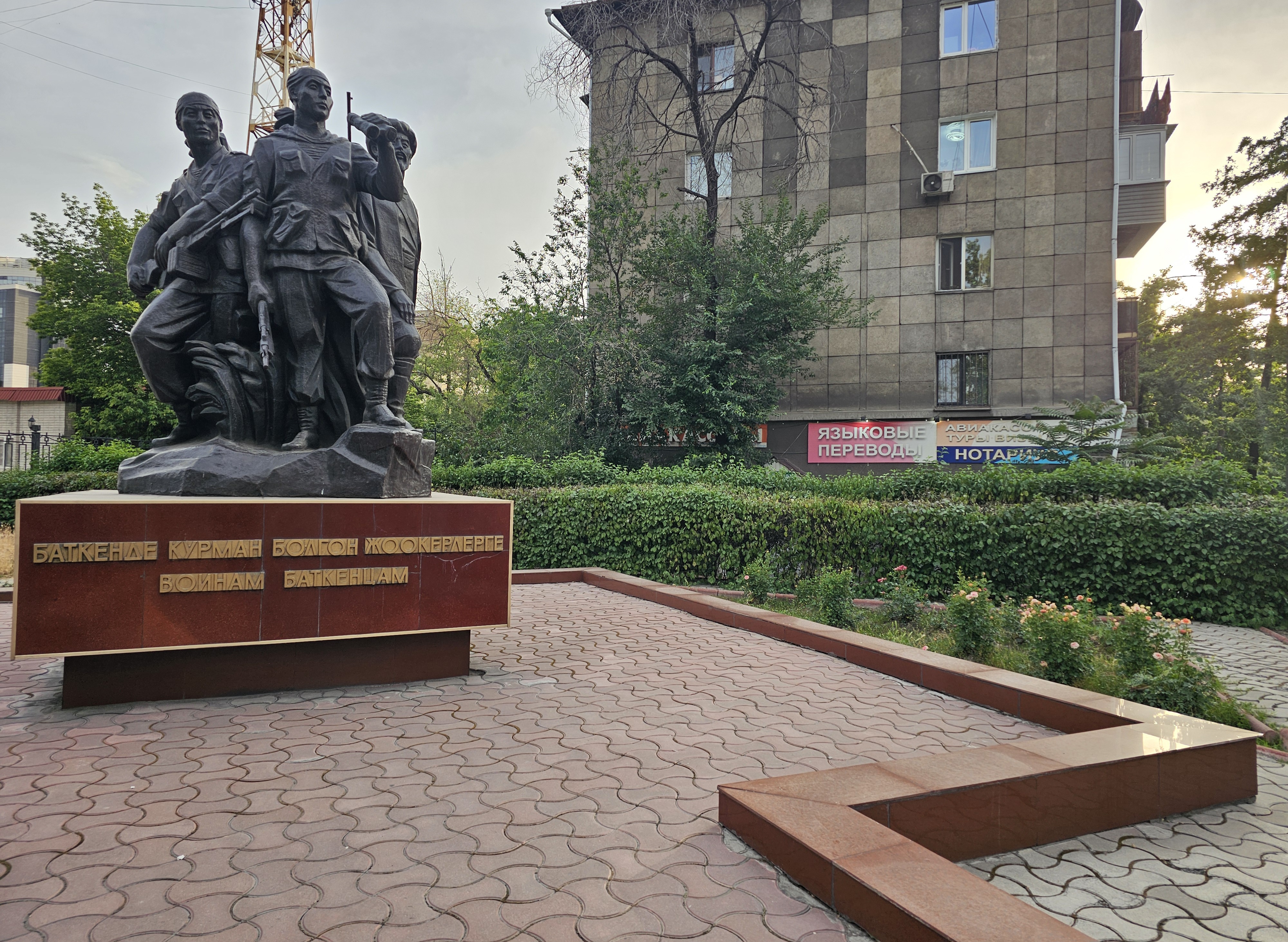 키르기스어로 '바트켄에서 희생된 군인들에게(БАТКЕНДЕ КУРМАН БОЛГОН ЖООКЕРЛЕРГЕ)'라고 쓰여 있고, 그 아래 러시아어로 '바트켄인 전사들에게(ВОИНАМ БАТКЕНЦАМ)'라고 쓰여 있습니다. 문구를 통해 이곳은 바트켄 사건의 희생자들을 기리는 기념공간임을 알 수 있죠.
