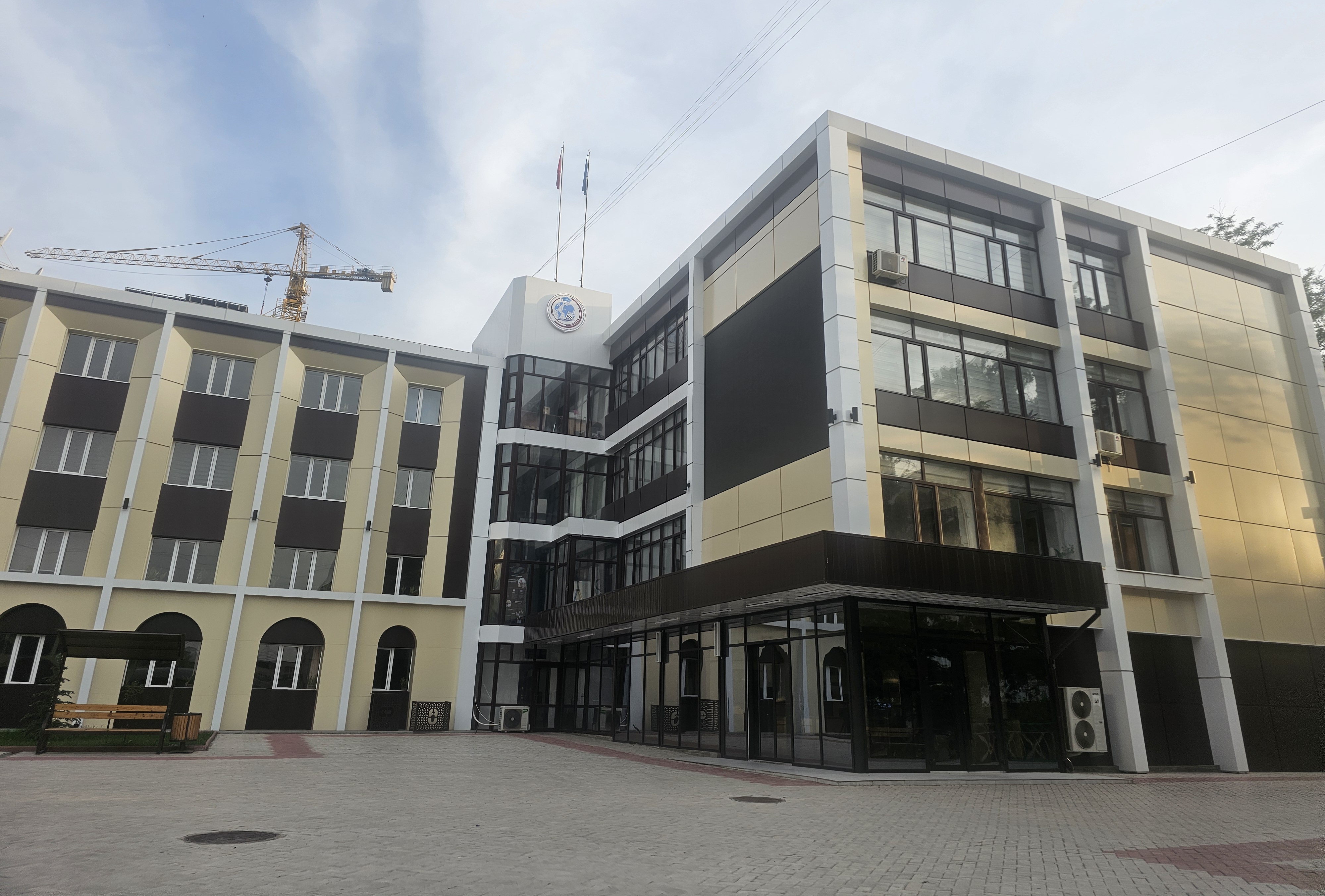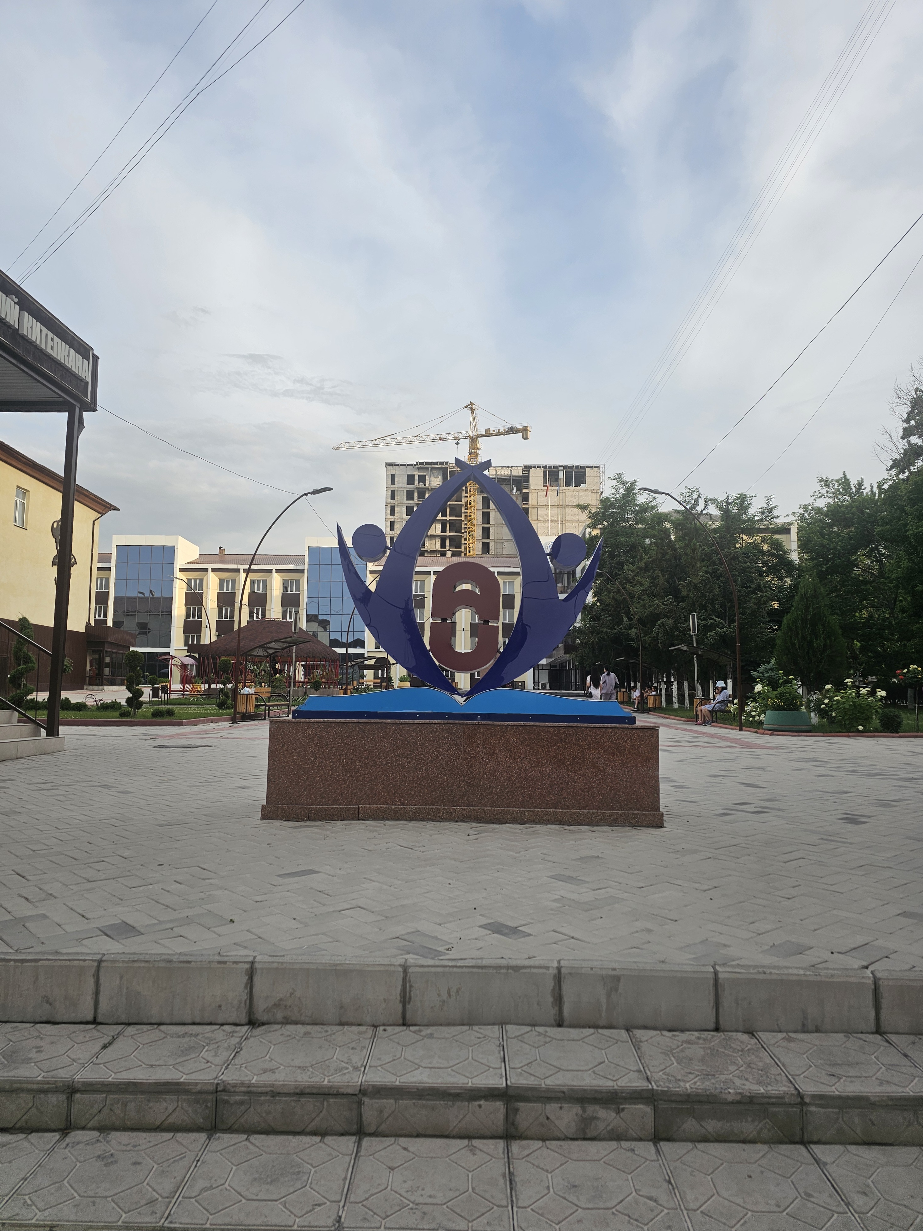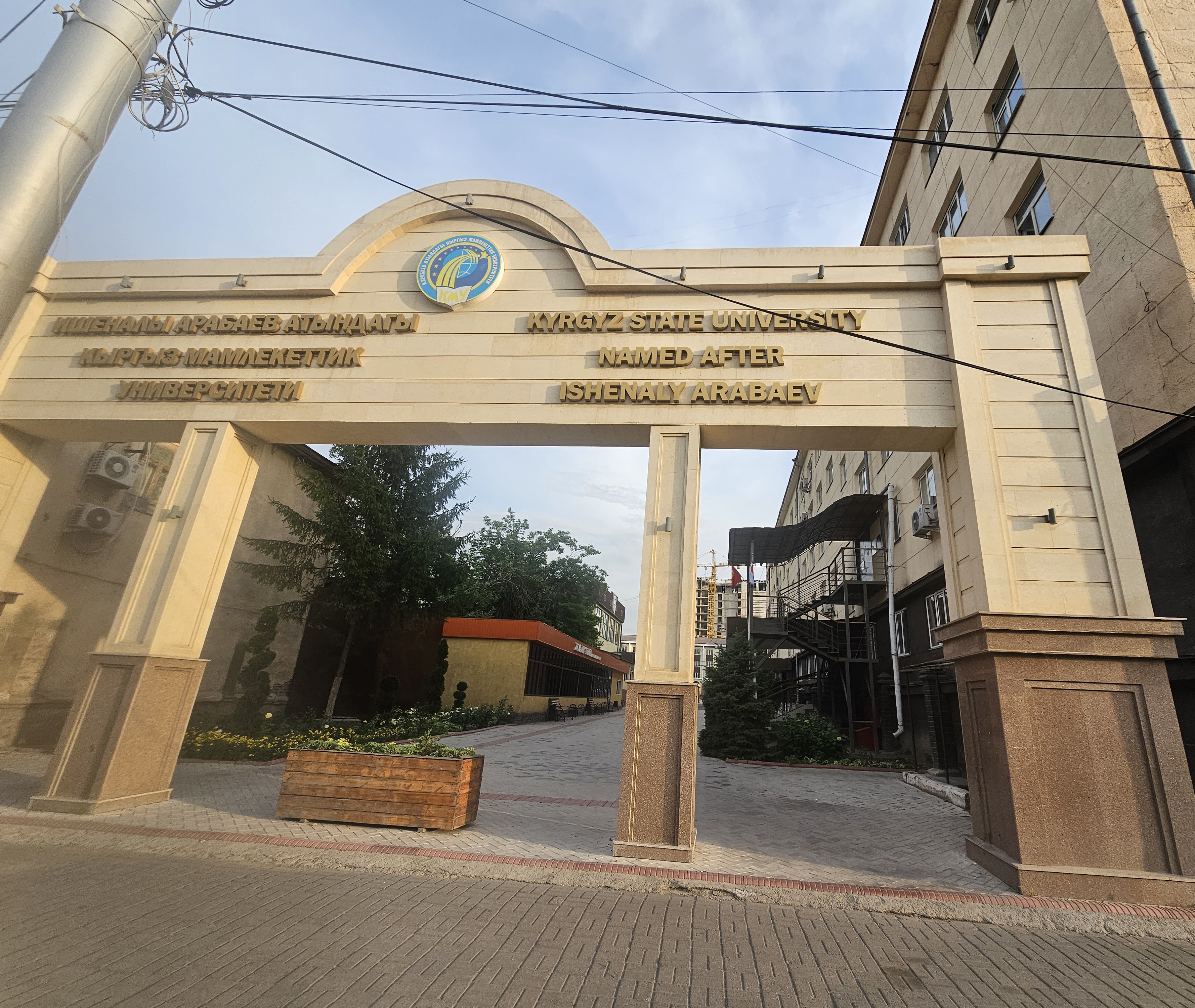 가장 인상적인 지점은 바로 이 5번 건물과 학술도서관 사이의 계단 위에 대학교 상징 로고가 세워져 있다는 것입니다. 상징 로고 아래의 책에는 대학 이름이 키르기스어와 러시아어로 쓰여 있습니다.