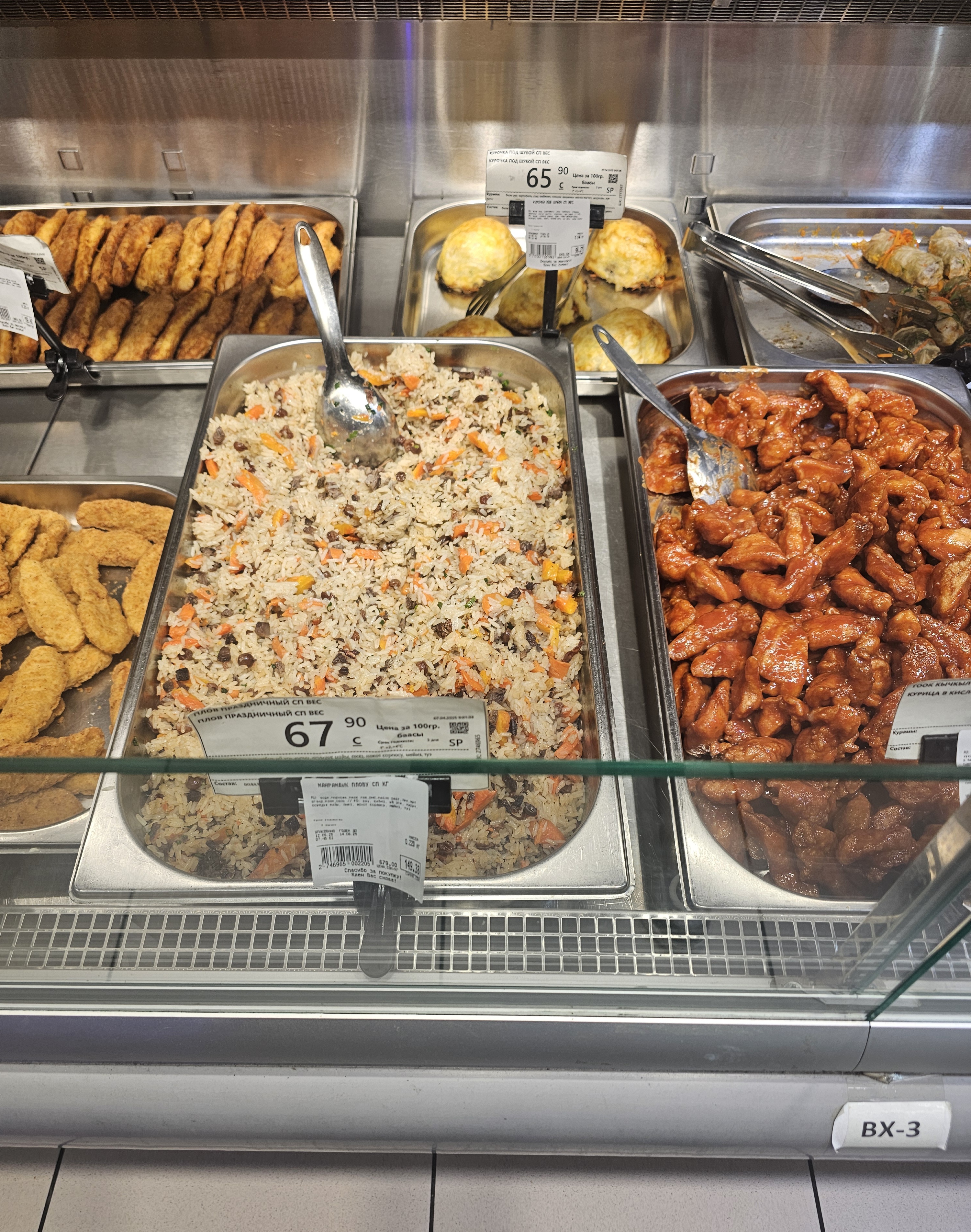 제가 가장 자주 사 먹었던 메뉴가 바로 자체 생산 중량 판매 축일식 플로프(ПЛОВ ПРАЗДНИЧНЫЙ СП ВЕС)입니다. 100g에 67.9솜 정도죠. 잔치와 같은 특별한 날에 주로 해먹었던 중앙아시아식 전통 플로프입니다. 밥에 양고기, 당근, 건포도(изюм) 등을 넣고 볶은 음식인데요. 처음엔 볶음밥 속 달달한 건포도가 낯설었지만, 먹다 보면 고소하고 은은한 단맛이 조화를 이루어 계속 손이 가는 맛이었습니다. 비슈케크파크에서 간단히 한 끼 해결하고 싶다면, 아지야 슈퍼마켓의 포장음식 코너를 꼭 들러보세요!