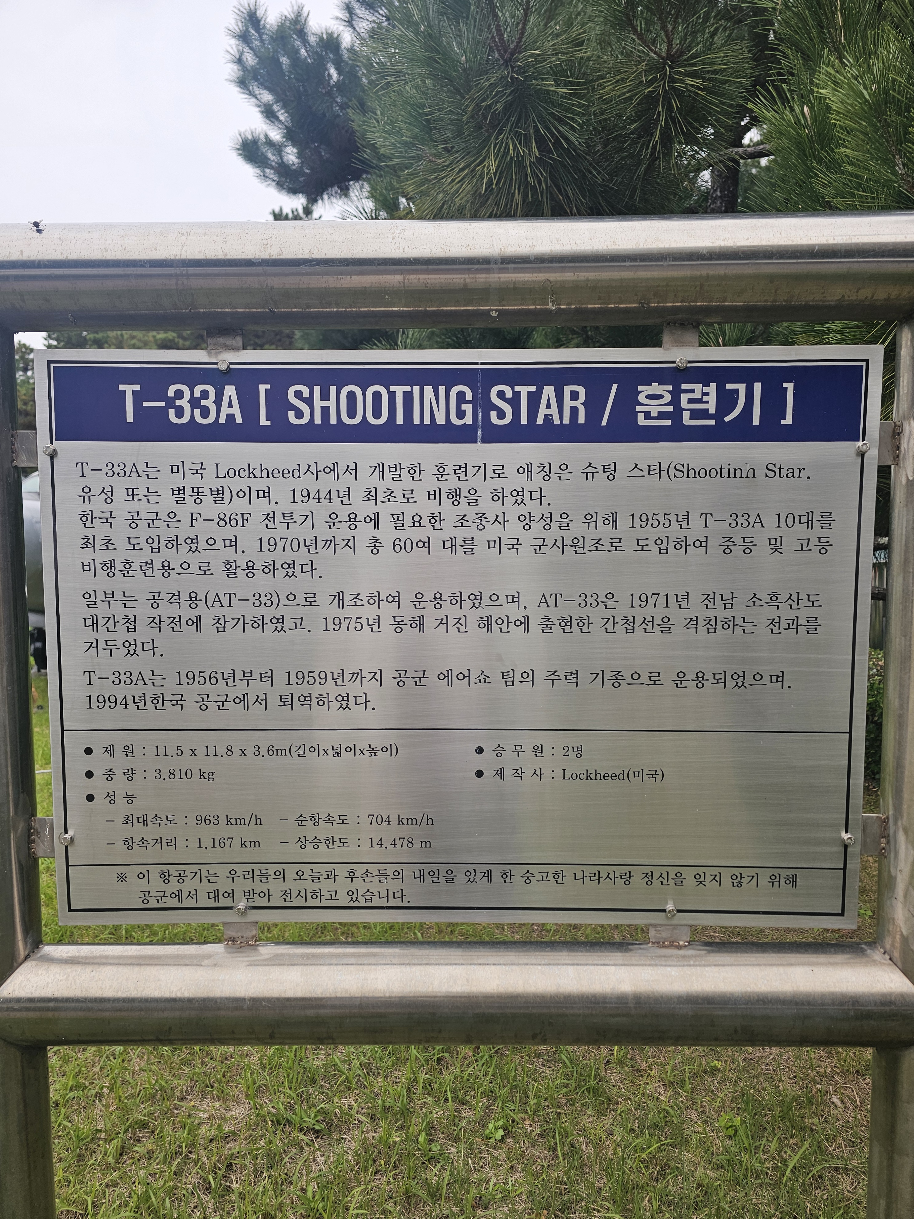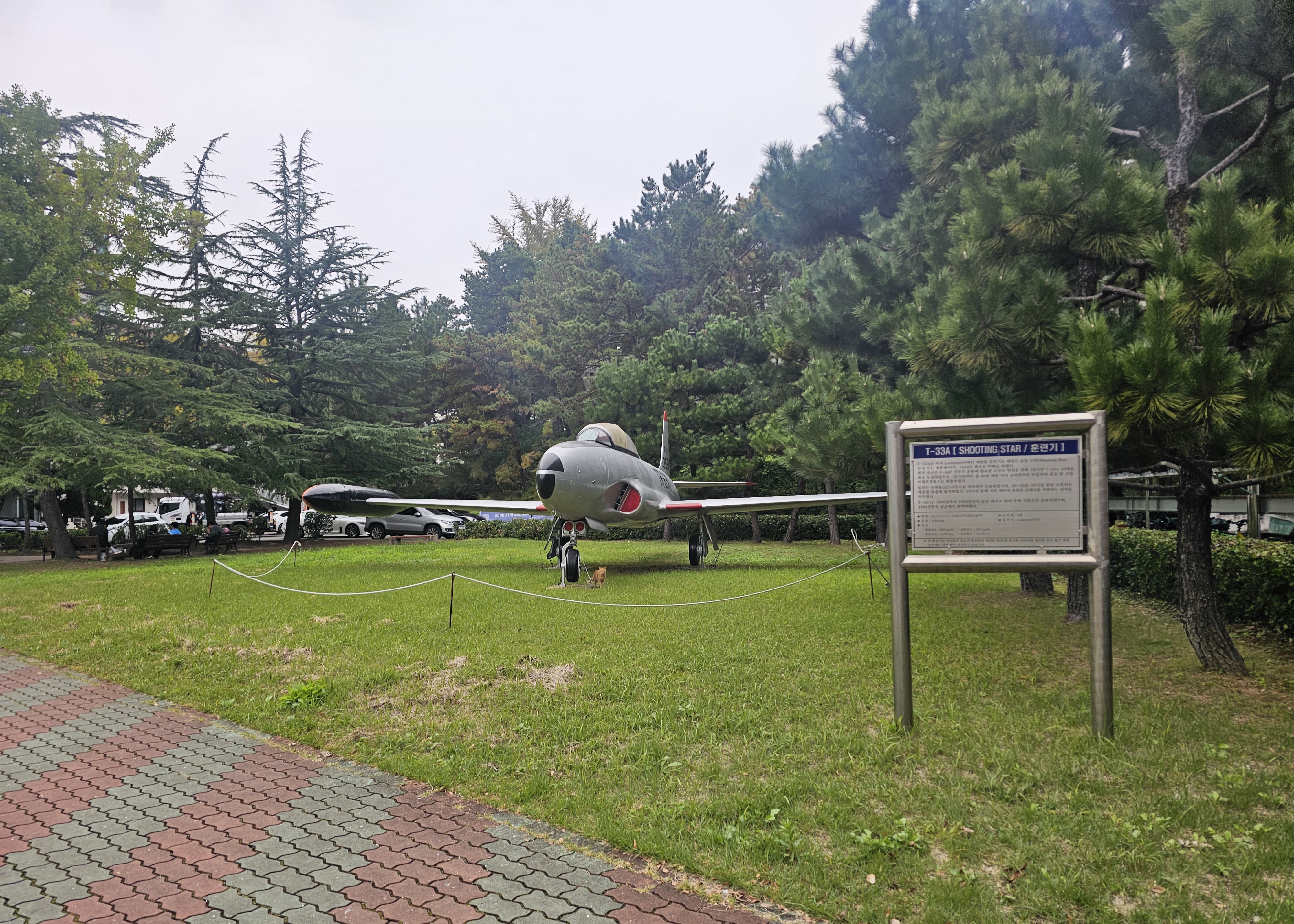 한국 공군은 노스아메리칸항공(1928-1996)에서 만든 F-86F 전투기 운용에 필요한 조종사 양성을 위해 훈련기 T-33A 10대를 최초 도입했고, 1970년까지 총 60여 대를 미국 군사원조로 도입하여 중고등비행훈련용으로 활용합니다. 그리고 1956년부터 1959년까지 공군 에어쇼팀의 주력 기종으로 운영되다가 1994년 한국 공군에서 퇴역했다고 합니다. 그 중 하나를 우리들의 오늘과 후손의 내일을 있게 한 숭고한 나라사랑 정신을 잊지 않기 위해 대한민국 공군에서 이 훈련기를 대여받아 이곳에서 전시하고 있습니다.