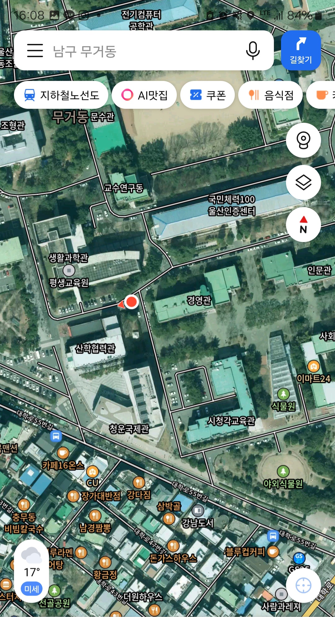 울산 남구 대학로를 따라 가면 울산과학대학교 서부캠퍼스 북쪽에 위치한 울산대학교가 있습니다.