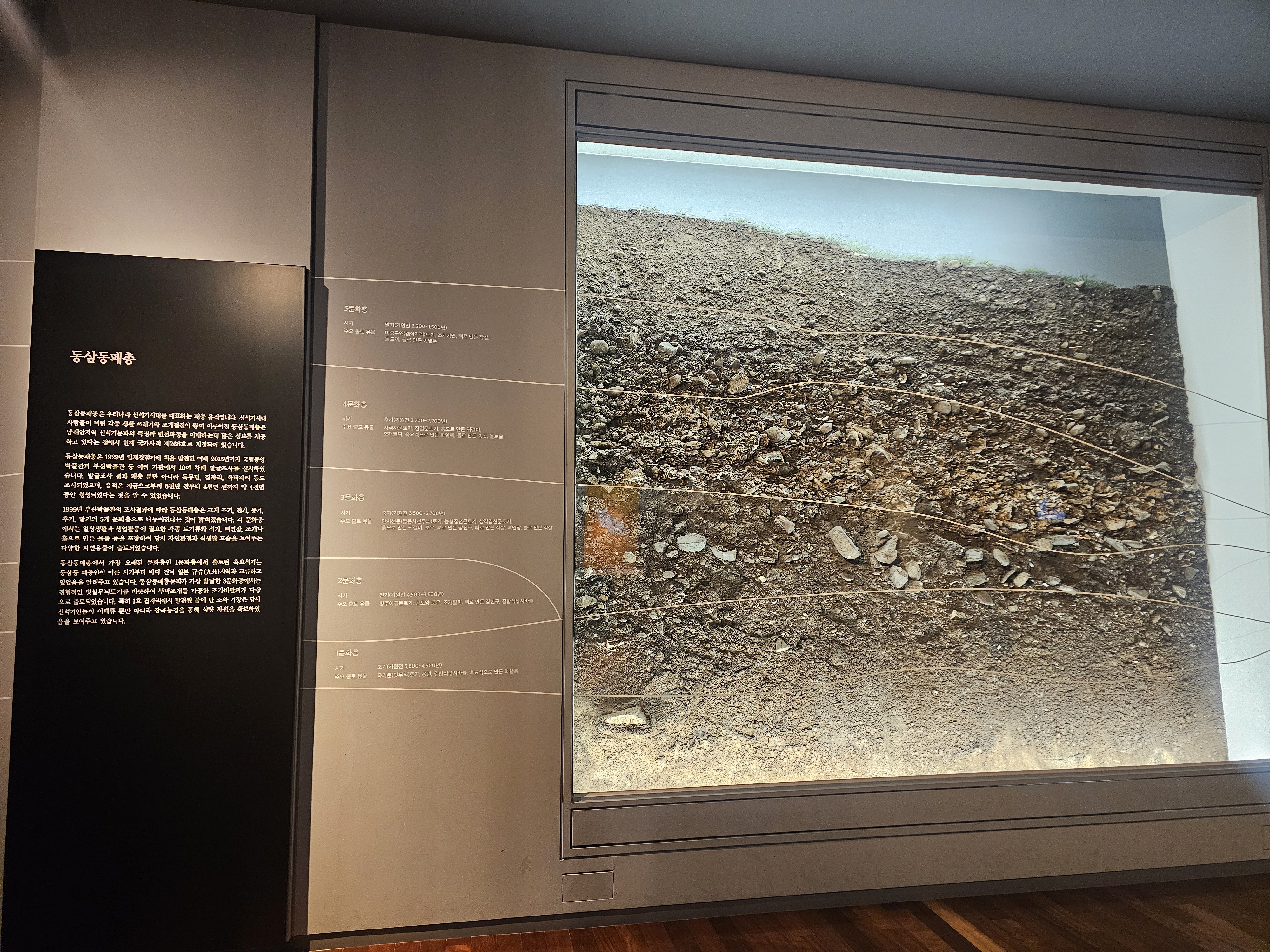 총 5개의 문화층으로 이루어진 한반도 신석기시대의 대표적인 패총 유적인 부산 영도구에 위치한 동삼동 패총의 모습입니다. 여기서는 토기와 석기, 뼈연장, 조개 등과 다양한 자연환경과 식생활 모습을 보여주는 자연유물도 출토되었다네요. 특히 이곳에서 출토된 흑요석기를 통해 일본 규슈와 교류를 했다는 사실과 집자리에서 발견된 탄 조와 기장으로 어업뿐 아니라 잡곡농경 했다는 것을 확인할 수 있습니다. 이 동삼동 패총 말고도 부산에는 영선동 패총, 범방동 패총, 금곡동 패총(금곡동 율리 패총) 등이 있으며, 가덕도에는 신석기 집단 무덤도 발견되었다고 합니다.