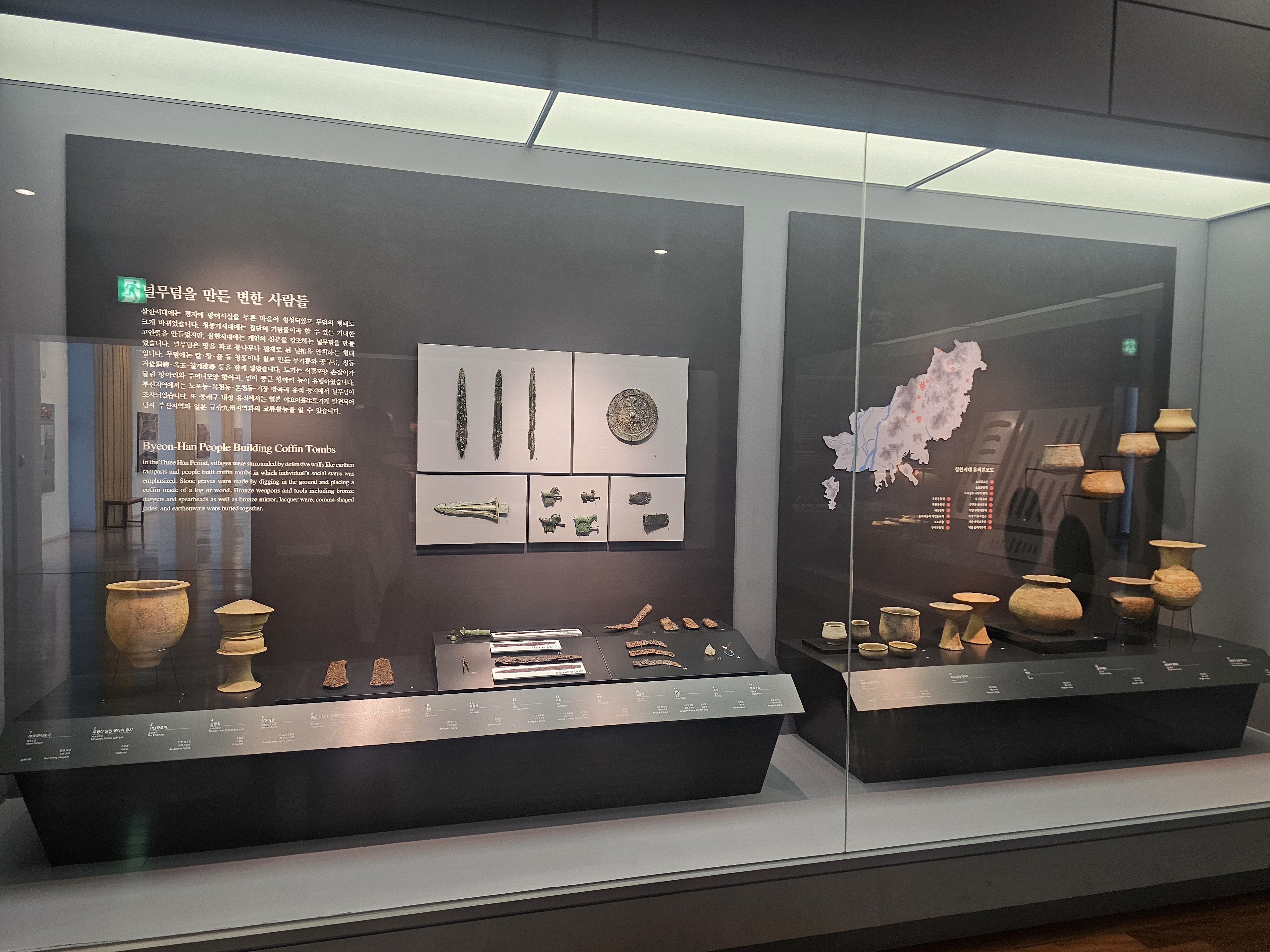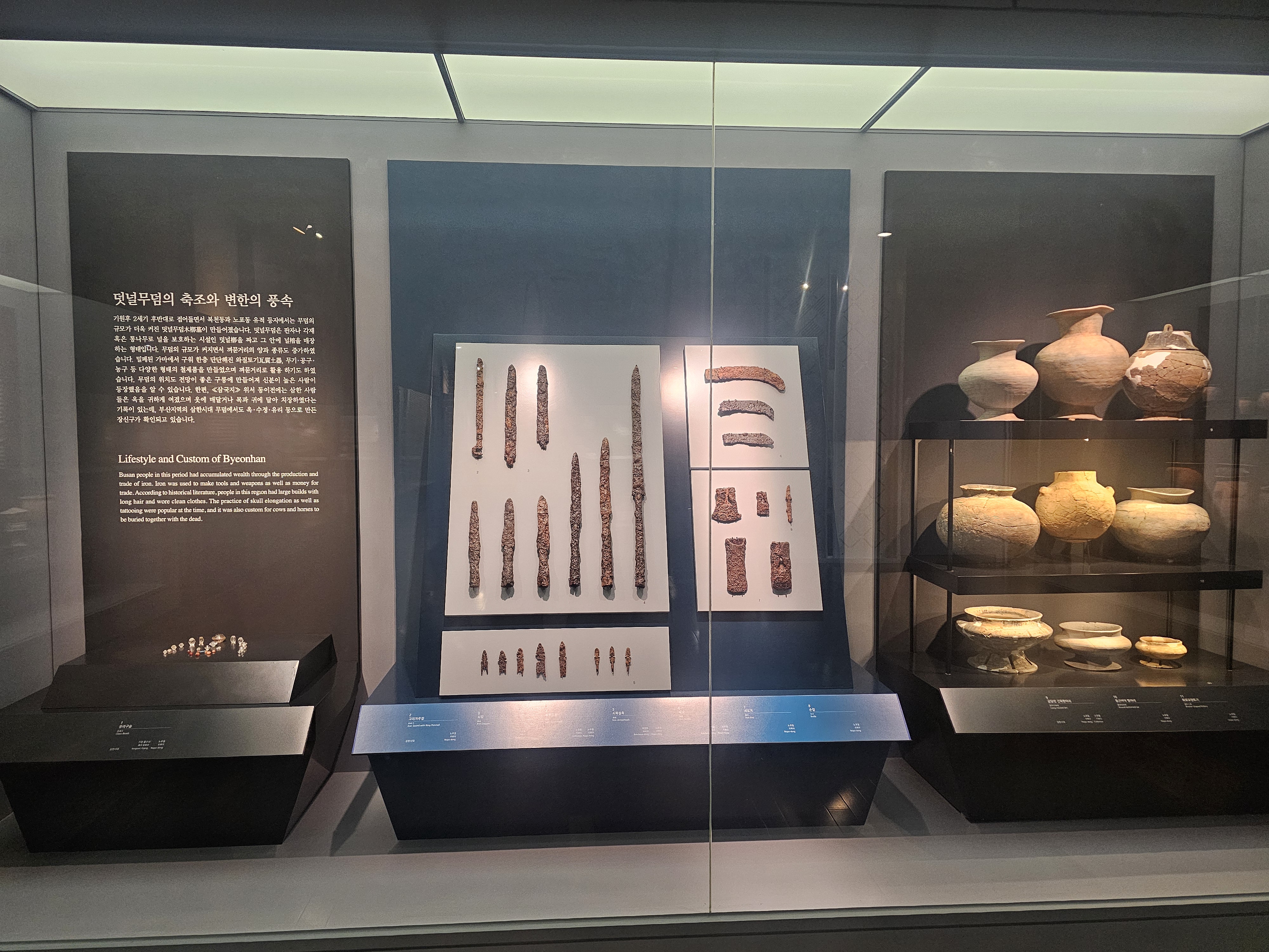 기원전 3세기쯤, 중국 대륙에서 철기문화가 한반도로 들어오며, 철기시대가 시작됩니다. 그렇게 국가급의 정치집단이 형성되는데, 한반도 북부에는 부여, 고구려, 동예, 옥저가, 남부에는 고조선의 유민을 받아들인 마한(54개 소국), 진한(12개 소국), 변한(12개 소국)으로 구성된 삼한이 형성됩니다. 그 중 변한의 독로국이 지금의 부산 지역에 위치한 것으로 추정되죠. 이 시대에는 널무덤과 덧널무덤과 같은 무덤의 규모가 커지고, 철제품이 만들어지기 시작하거나 철 자체를 화폐로 쓰기 시작하였죠. 특히 남부의 철은 한, 예, 왜, 낙랑, 대방까지 수출되었다고 하며, 그렇게 부산을 포함한 변한과 진한 지역은 철을 기반으로 가야 문화와 신라 문화가 꽃핍니다.