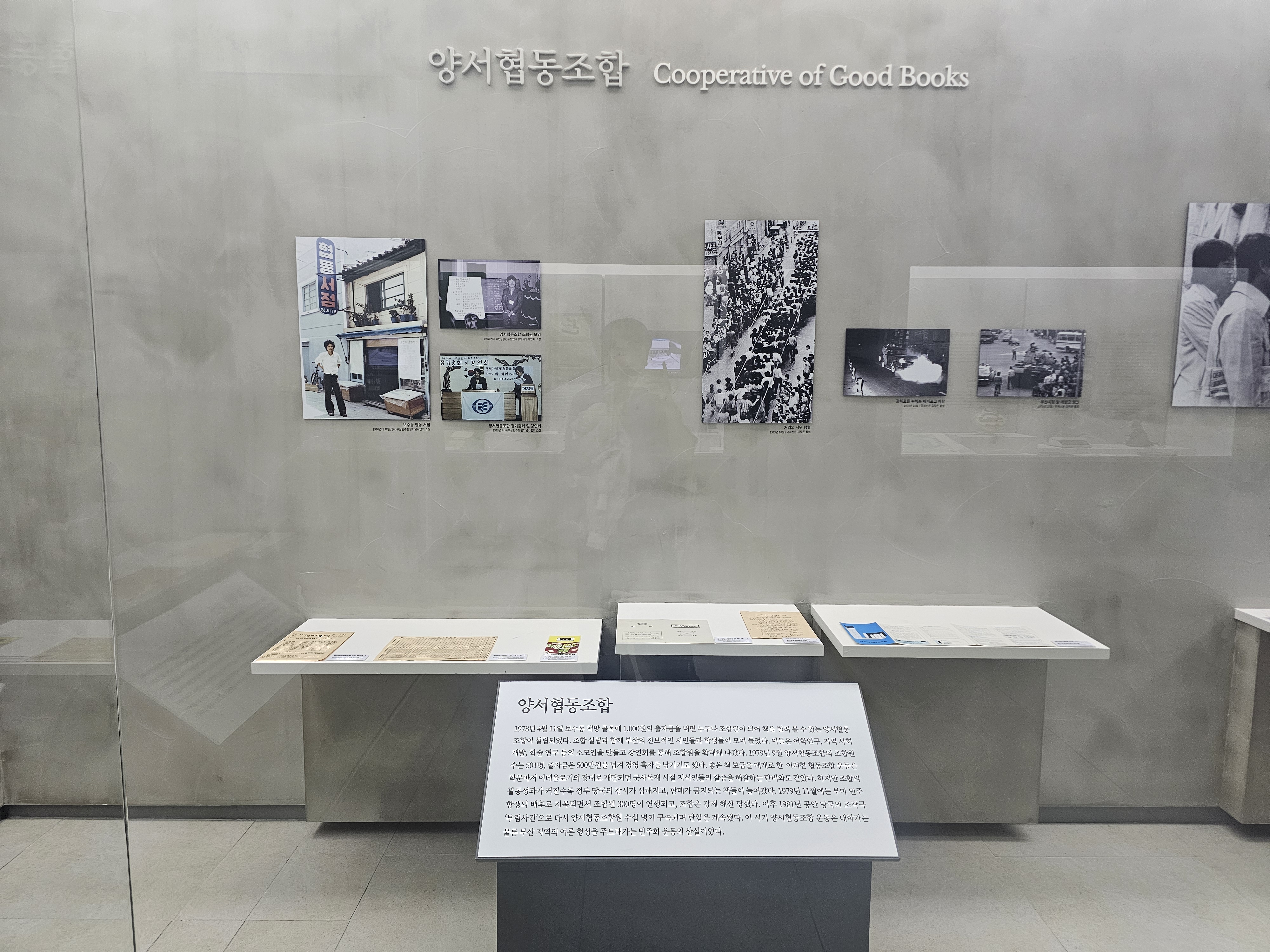 그 중 흥미로운 부분은 1978년 4월 11일 보수동 책방골목에 1000원의 출자금을 내면 누구나 조합원이 되어 책을 빌려 볼 수 있는 부산양서판매이용협동조합(1978.04.11.-1979.11.19.)입니다. 여기서는 부산의 진보적인 시민들과 학생들이 모여 어학연구, 지역사회개발, 학술연구, 강연회를 진행했는데, 다양한 사상의 책들을 공부하다보니 정부 당국의 감시가 심해지고, 부마민주항쟁의 배후로 지목되며 조합은 1979년 11월에 강제 해산됩니다. 해산 후에도 전 조직원들에게 부림사건(釜林事件, 부산학림사건, 1981) 등으로 탄압을 하기도 했다고 합니다.
