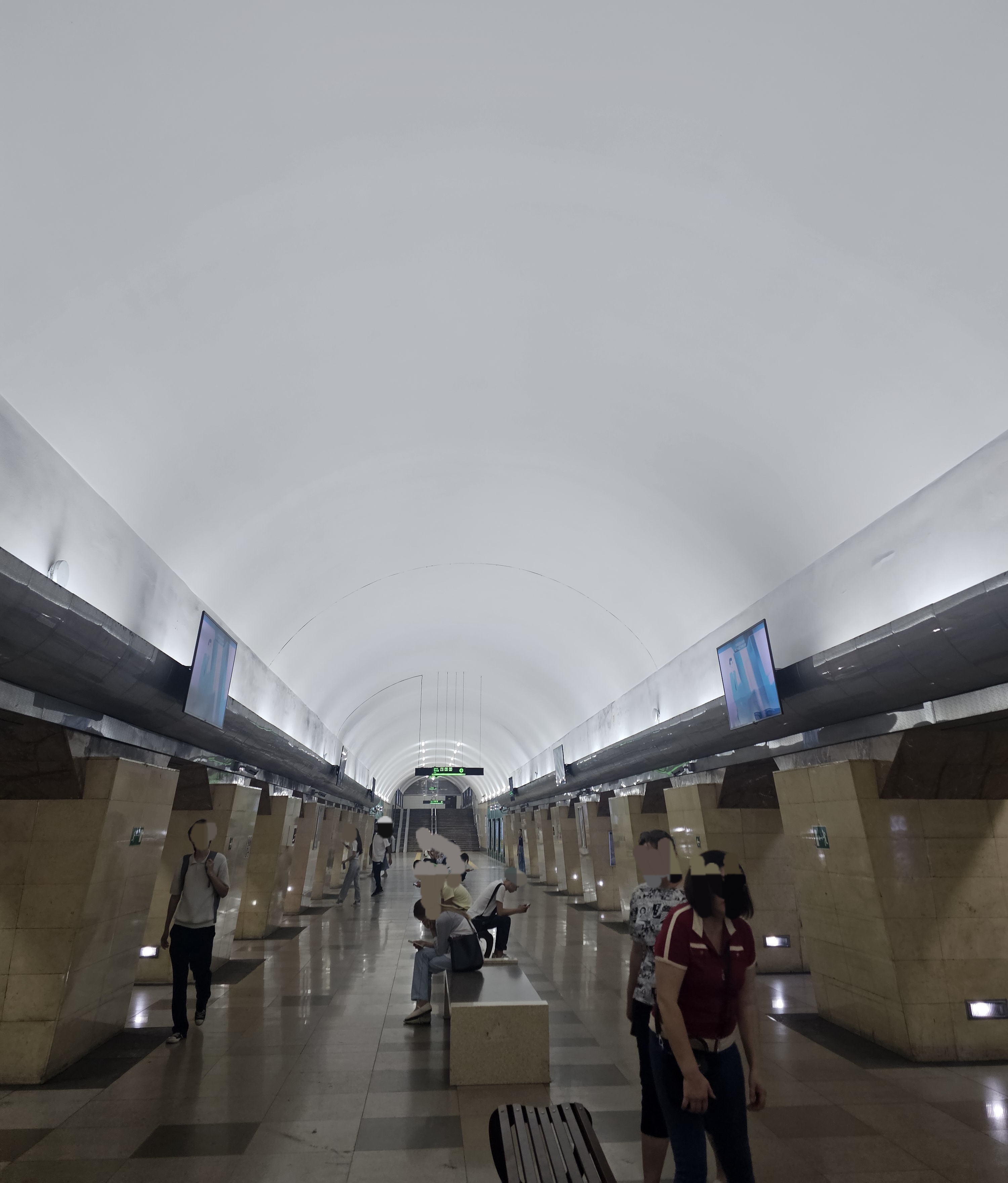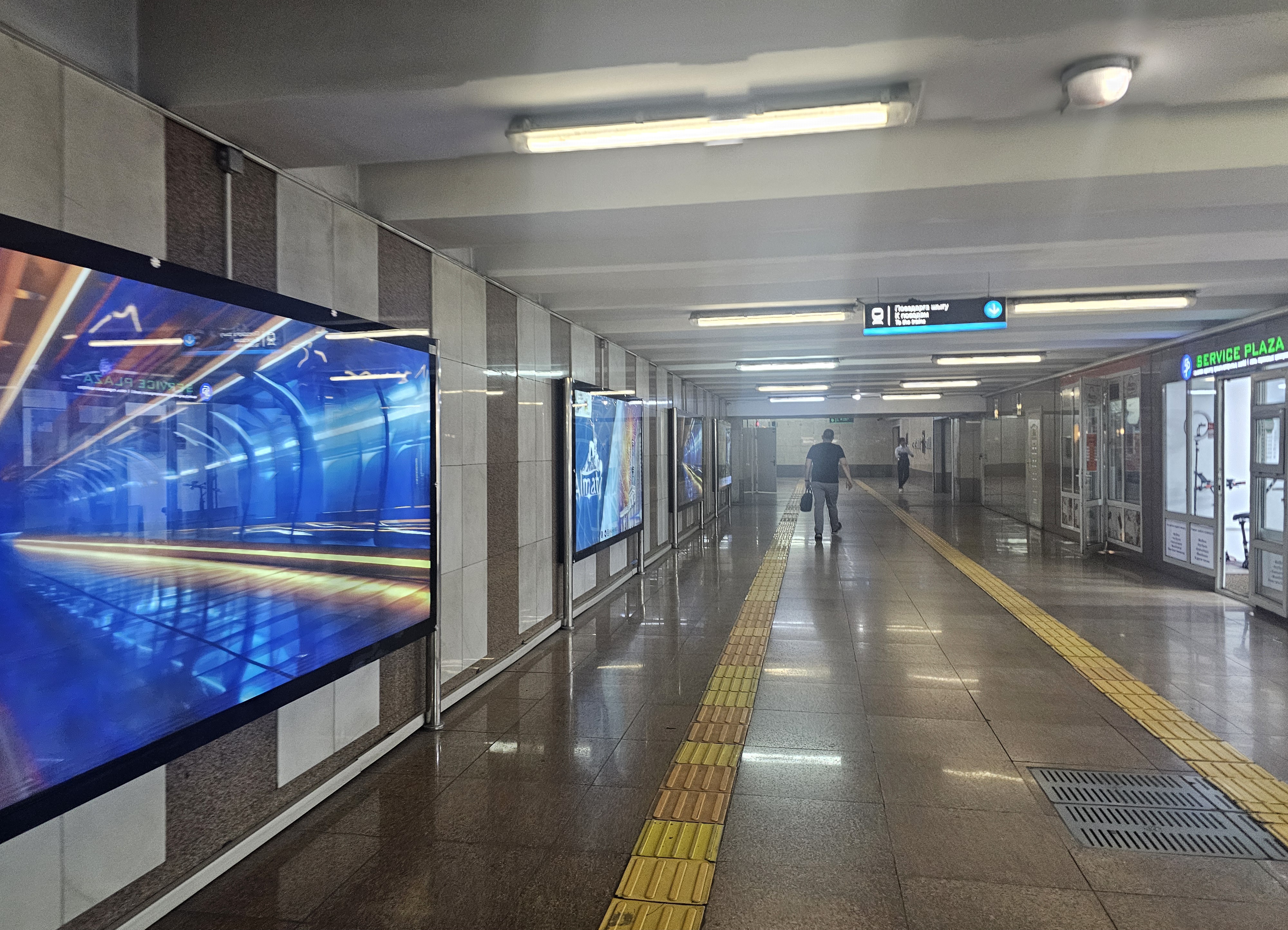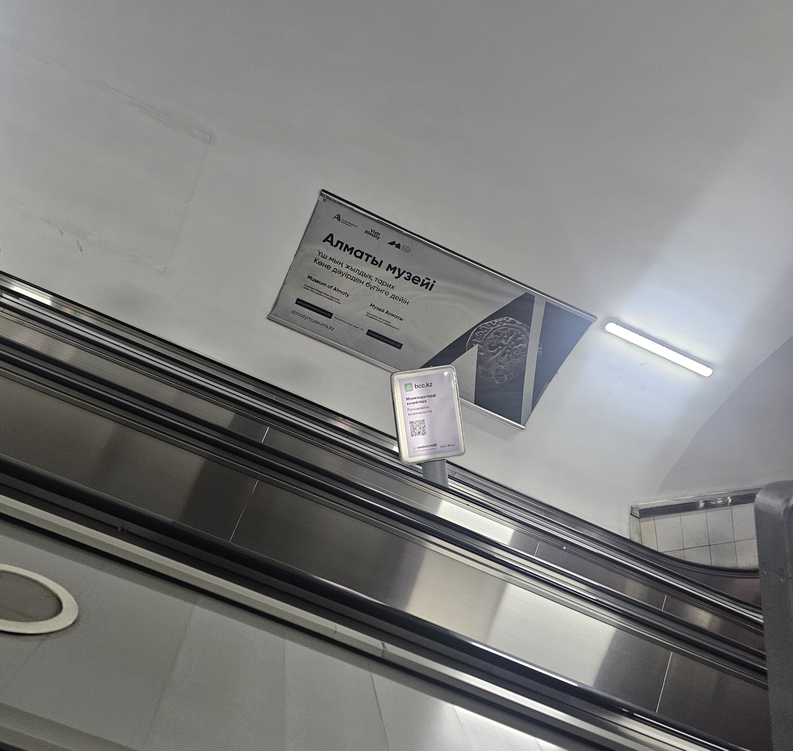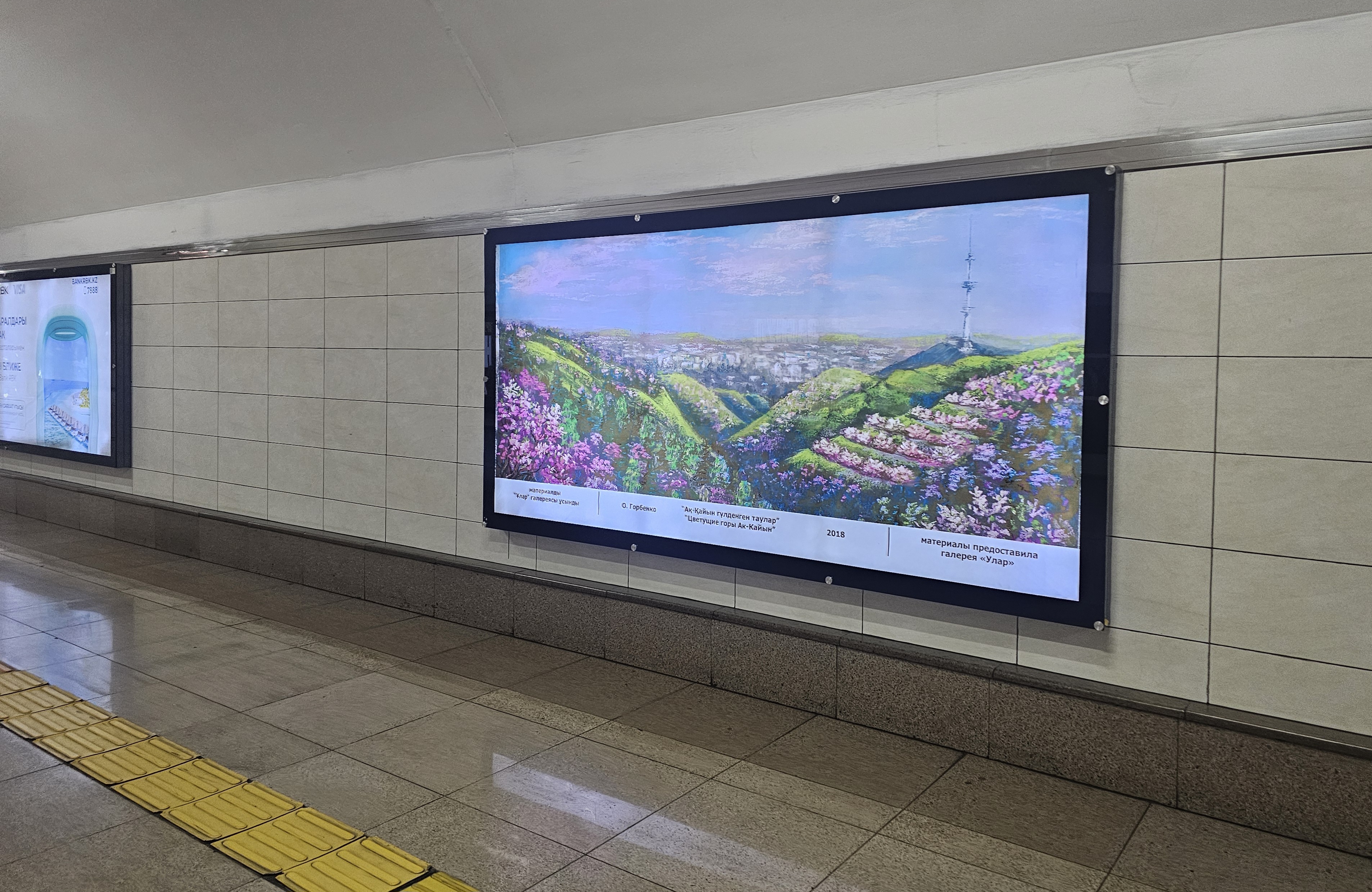 계단을 내려갑니다. 여러 광고들과 그림 이미지들이 전광판에 보입니다. 그중 인상적이었던 건 알마티 남부에 위치한 악카이인(흰 자작나무, Аккайын)이라는 별칭으로도 유명한 자작나무숲(Берёзовая роща)에서 바라본 알마티의 풍경도 참 이쁩니다. 텔레비전탑 콕토베(코크토베, Коктобе)가 있는 콕토베(코크토베)의 모습도 오른쪽에 살짝 보이네요.