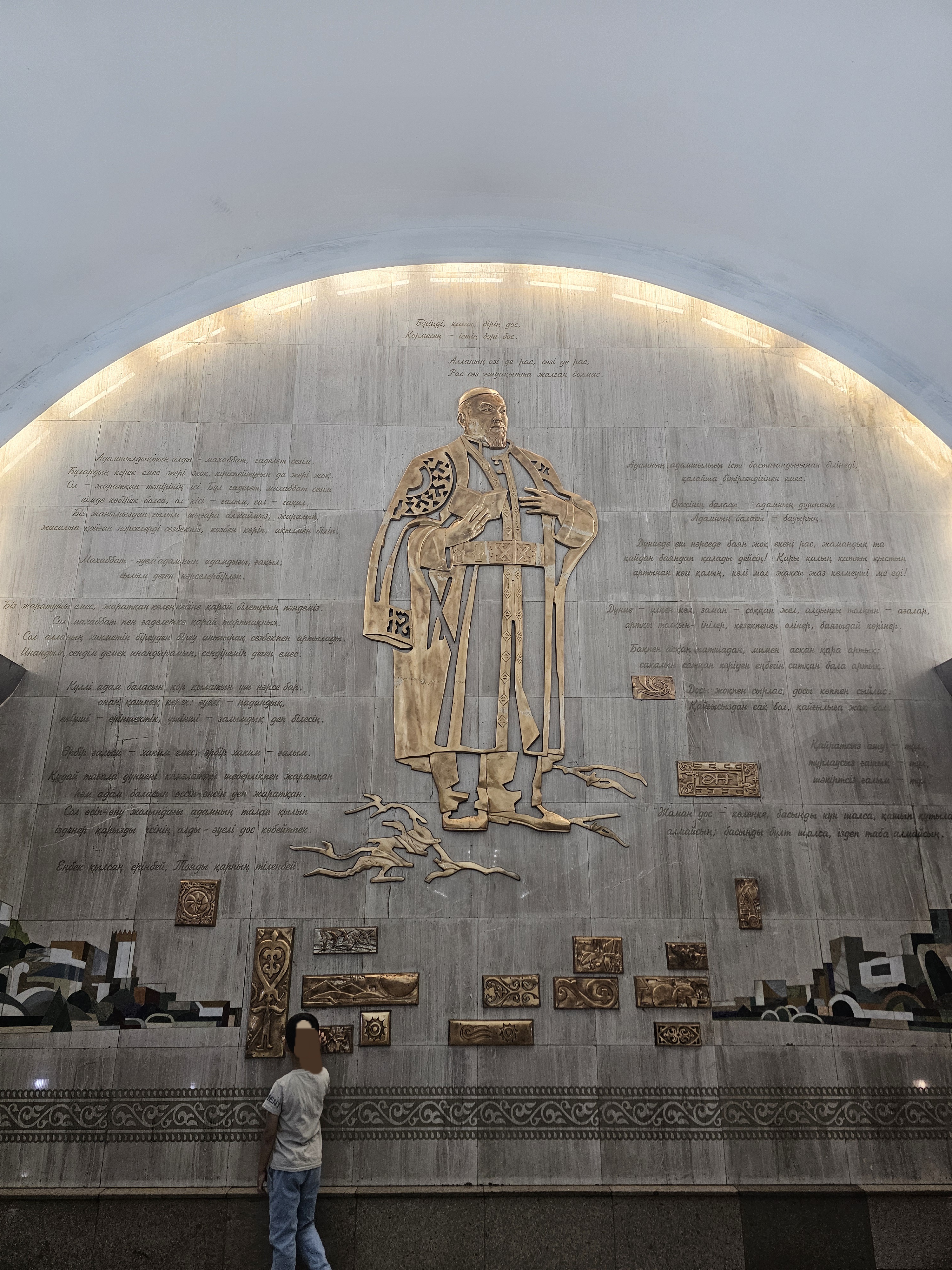 이 아바이역의 하이라이트는 바로 플랫폼에 위치한 아바이 쿠난바예프(Абай Құнанбаев, 1845-1904)의 벽화입니다. 그의 작품 내용이 같이 새겨져 있습니다. 웅장한 그의 양각을 보고 있으면 마치 그와 카자흐의 문학세계로 빨려 들어갈 것 같은 느낌이 듭니다.