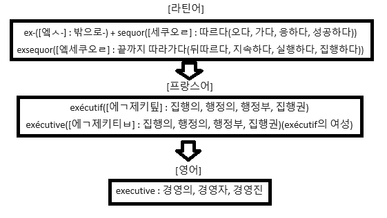 영어 단어 executive는 '밖으로 따름(뒤따름)'라는 근본적인 뜻을 가집니다. 여기에서 뜻이 파생되어 '실행하다(집행하다)' 등이 강조되면서 프랑스어로 '집행의, 행정의'라는 뜻의 exécutif[엑제키팊]라는 단어로 발전합니다. 이 단어가 영어로 넘어오며 '경영의, 경영자(경영진)'이라는 뜻으로 확대되었죠.