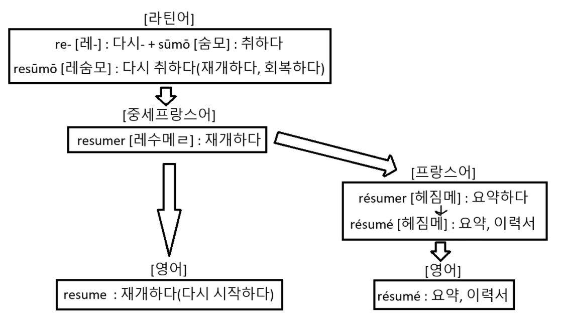 근본적으로 '다시 취하다'라는 뜻을 가지는 동사 resume은 '다시 취하다->(업무, 원래 있던 자리 등을) 다시 취하다'라는 뜻으로 의미가 확장됩니다.