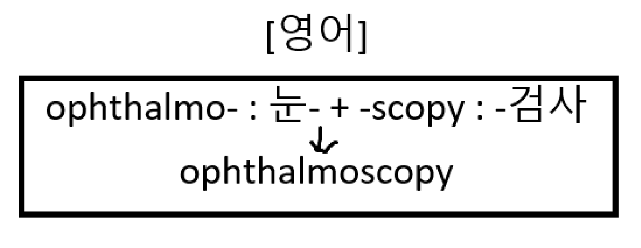 '눈-'이라는 뜻의 접두사 ophthalmo-와 '-관찰'이란 뜻의 접미사 -scopy가 합쳐져 명사 ophthalmoscopy가 등장합니다.