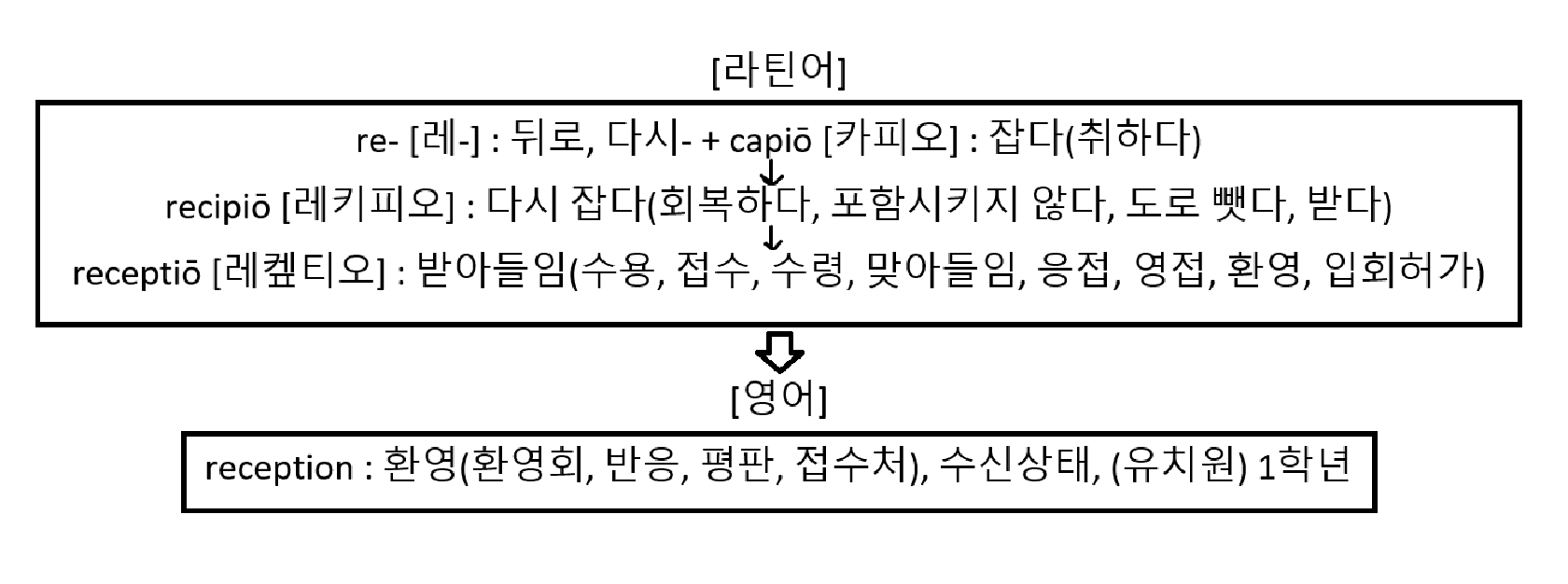 라틴어로 '다시(re-) 잡(cip)은 것(-tiō)'이라는 뜻의 receptiō [레켑티오]에서 영어 reception이 유래했습니다.