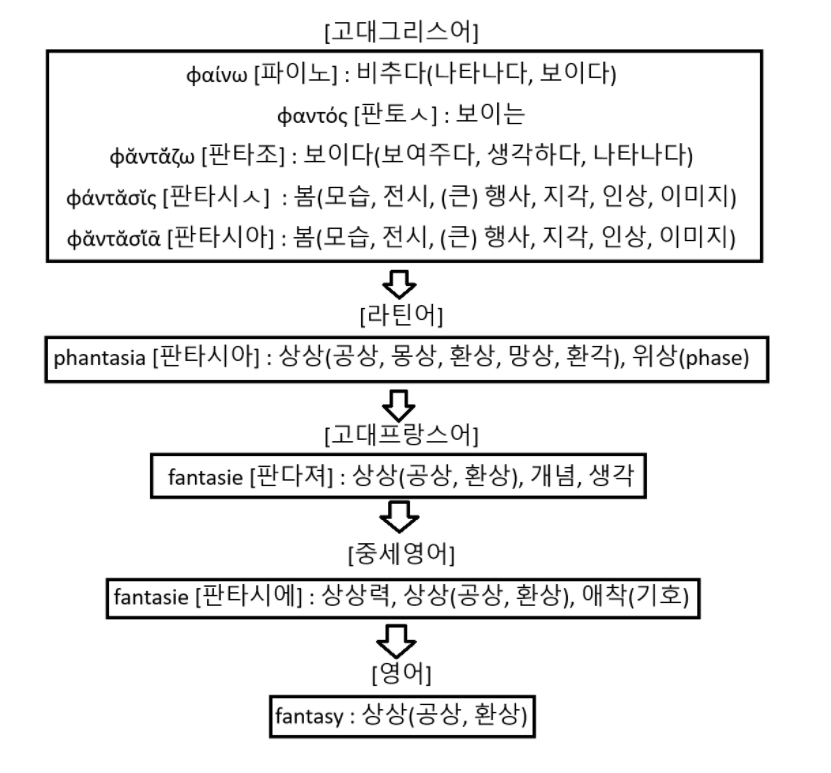 근본적으로 '비추어져 보이는 것'이라는 뜻을 가진 fantasy는 현대 영어로 들어오면서 그 뜻을 그대로 가지고 있습니다.