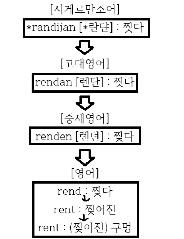 '찢다'라는 뜻의 서게르만조어 동사 *randijan [*란댠]에서 같은 뜻의 영어 동사 rend가 등장했고, 이 동사의 과거분사형인 rent(찢어진)에서 '찢어진 것->찢어진 구멍'이란 뜻으로 의미가 바뀐 명사 rent가 등장합니다.